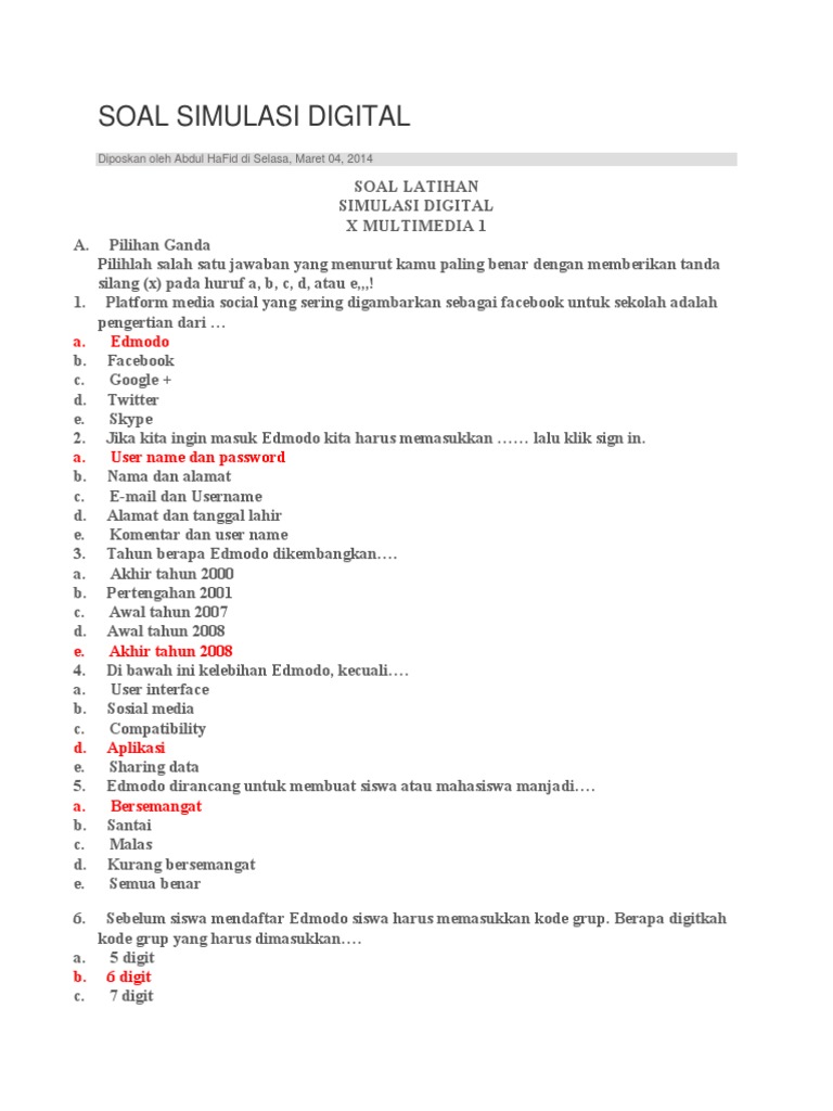 Fitur yang tidak dimiliki oleh aplikasi komunikasi daring diantaranya adalah. Soal latihan simulasi digital a. Pada kesempatan yang baik ini saya akan berbagi kepada bapak ibu saudara sekalian para guru sebangsa dan setanah air tentang soal latihan simulasi digital untuk menghadapi uas semester 1 tahun. E mail dan username d. Inilah pembahasan lengkap terkait contoh soal pilihan ganda simulasi digital dan jawabannya. Langsung saja kita menuju soal dari pelajaran simulasi digital itu sendiri dan tentunya saya juga sudah menyediakan jawabannya supaya teman2 semua bisa lebih mudah untuk mempelajarinya.