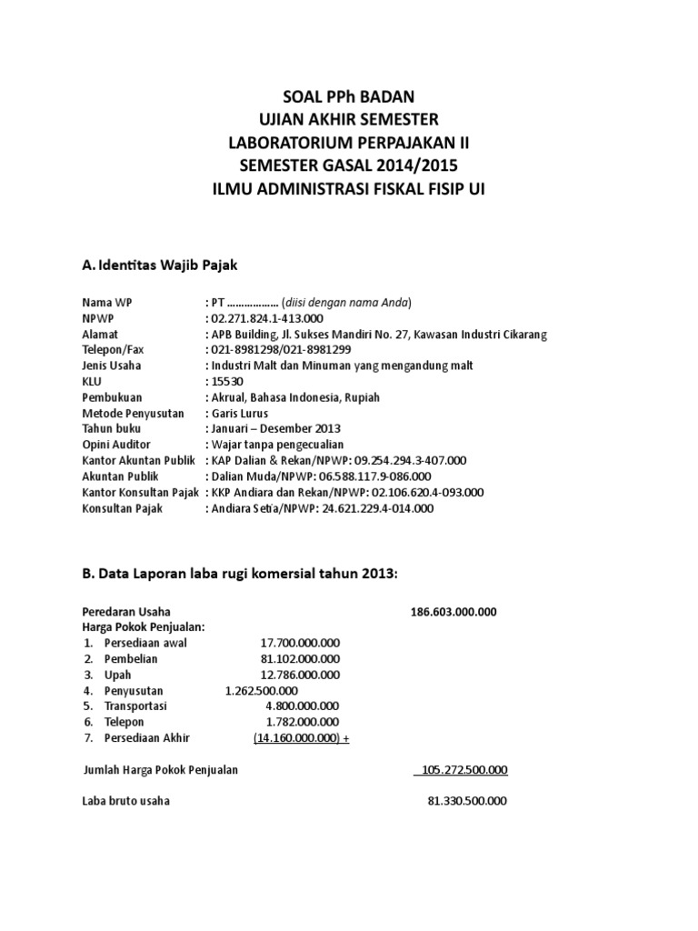 Modul practice perpajakan sample questions and discussion. Contoh soal dan jawaban rekonsiliasi fiskal kasus 1 pt. Pertama badan usaha yang memiliki pendapatan bruto sampai rp48 miliar per tahun atau sering disebut usaha mikro kecil dan menengah umkm berdasarkan peraturan pemerintah nomor 23 tahun 2018 dikenakan tarif pajak pph final yaitu pph pasal 4 ayat 2 dengan perhitungan pajak 05 dikalikan dengan seluruh pendapatan bruto dari hasil usaha. Admin blog contoh soal terbaru 2019 juga mengumpulkan gambar gambar lainnya terkait contoh soal pph badan dan jawabannya 2017 dibawah ini. Mencari informasi terkait contoh soal pph badan dan jawabannya. Contoh soal dan jawabannya jurnal hingga neraca saldo akuntansi.