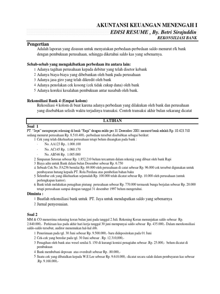 Contoh soal dan penyelesaian rekonsiliasi bank 2 kolom pt adi jaya merupakan perusahaan yang bergerak dibidang perdagangan. Posted in akuntansi tagged bank pdf pengertian rekonsiliasi laporan bank telah mencatat sedangkan perusahaan belum bank tujuan rekonsiliasi bank penyebab bentuk mendatar yaitu bentuk bentuk bentuk rekonsiliasi bank cara membuat rekonsiliasi bank contoh kasus laporan rekonsiliasi bank contoh soal dan jawaban rekonsiliasi bank 4 contoh. Contoh soal saham pada tanggal 2 januari 2015 pt adi jaya membeli 25000 lembar saham biasa pt reliefs dengan kurs 135 dan nilai nomi. Jika dibandingkan dengan saldo kas di bank yang tercatat di buku besar pt. Contoh soal rekonsiliasi bank 2 kolom dan jawabannya. Ilustrasi rekonsiliasi 4 kolom info pt apes.