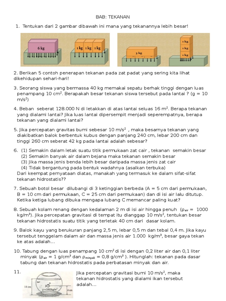 Contoh soal dan pembahasan tercakup tekanan pada zat padat tekanan pada zat cair tekanan pada gas hukum pascal hukum boyle pipa u dan tekanan gas dalam tabung manometer. Kumpulan soal zat padat ini disusun dalam bentuk pilihan berganda dilengkapi dengan pembahasan dan dirancang sedemikian berdasarkan konsep tekanan zat padat yang diajarkan agar murid dapat memahami konsep dasar tekanan pada zat padat. Zat cair memiliki volume tetap tetapi bentuk berubah ubah sesuai dengan yang ditempatinya. Tekanan hidrostatis atau tekanan zat cair. Hal utama yang mempengaruhi tekanan hidrostatis di suatu tempat diantaranya yaitu kedalaman massa jenis zat cair tersebut dan gaya gravitasi pada tempat tersebut. Baiklah taj usah berlama lama langsung saja simak soalnya.