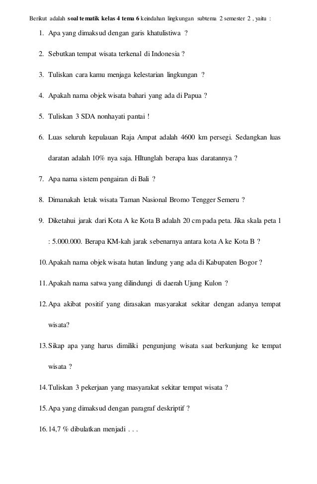 Nah itulah soal tematik kelas 4 sd tema 7 tahun 2017 semoga dapat menjadi bahan belajar adik adik tentang soal tema 7 kelas 4 sd tahun 2017. Hasil penjumlahan dari 46 150. Kumpulan soal ujian kelas 4 sd. Bilangan 37482 jika dibulatkan ke ratusan terdekat maka akan menjadi. Untuk contoh soal tema 1 kelas 4 kurikulum 2013 revisi terbaru bisa dibaca dan dipelajari di sini. Soal tema 8 kelas 4 sub tema 1.