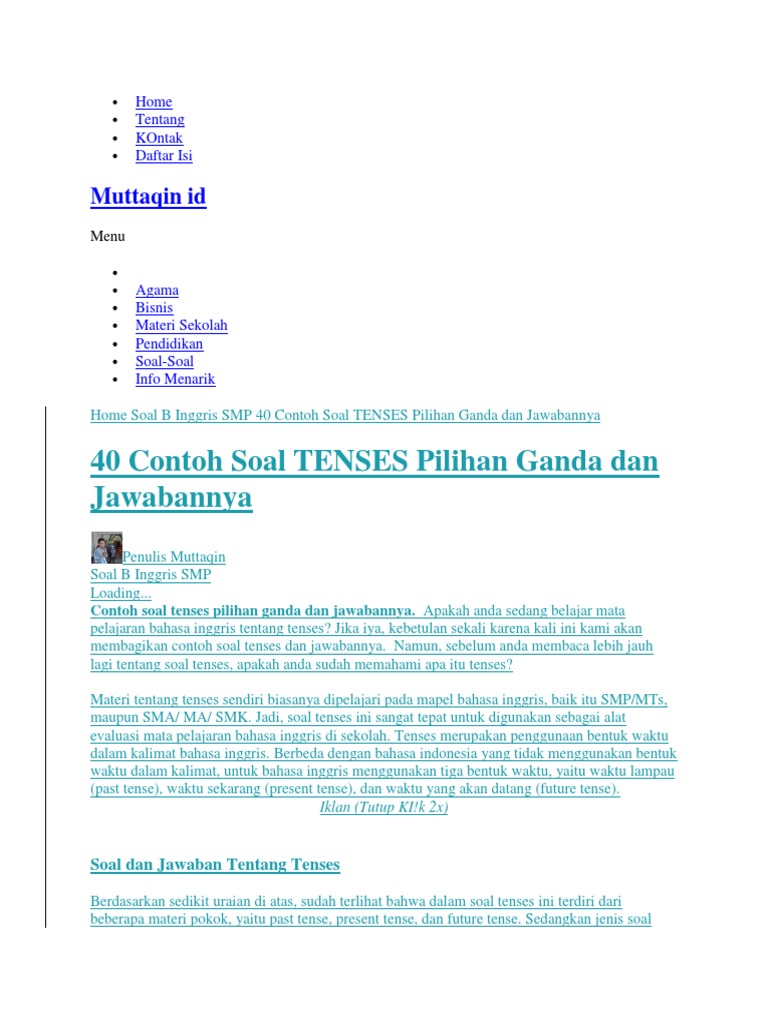 Tenses merupakan bentuk kata kerja dalam bahasa inggris untuk menunjukkan waktu present past future terjadinya suatu kegiatan atau peristiwa. 40 soal pilihan ganda tentang tenses dan jawabannya. Soal pilihan ganda. Itulah yang dapat kami bagikan terkait contoh soal tenses pilihan ganda beserta jawabannya. Setidaknya ada 40 soal pilihan ganda tentang tenses dan kunci jawabannya yang siap untuk membantu anda dalam memahami materi tenses. 5 5 5 votes labbahasainggriscoid artikel hari ini saya akan memberikan beberapa informasi tentang 100 contoh soal simple present tense dan jawabannya yang terdiri dari bentuk soal pilihan ganda dan essay.