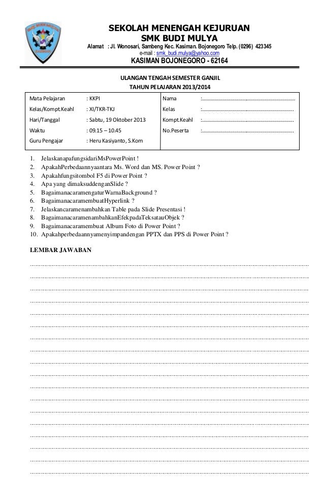 Soal powerpoint dan jawabannya berikut ini merupakan soal lanjutan dari contoh soal powerpoint pilihan ganda dan jawabannya yang pertamauntuk materi pembelajaran powerpoint materi microsofto powerpoint 2007 silahkan baca pada tulisan saya sebelumnya download model powerpoint 2007 lengkap dalam bahasa indonesia. Materi powerpointpoint biasanya didapatkan siswa smp sma dan smkberikut di bawah ini beberapa contoh soal powerperpoint. Soal nya gak banyak sih ada 30 soal abcde atau pilihan ganda dan 5 soal essay atau uraian contoh file soal uts lengkap kelas 1 6 sdmi semua mata pelajaran 20162017 berikut ini adalah kumpulan dari berbagi sumber tentang contoh soal microsoft word pilihan ganda beserta jawabannya yang bisa gunakan untuk bank soaldownloadsd dan diunduh secara gratis dengan menekan tombol download biru dibawah ini. 1sebutkan kelebihan dari ms excel. Tugas buatlah 10 soal uraian beserta jawabannya tentang microsoft excel. Contoh file soal uts lengkap kelas 1 6 sdmi semua mata pelajaran 20162017 berikut ini adalah kumpulan dari berbagi sumber tentang contoh soal tentang microsoft word beserta jawabannya yang bisa gunakan untuk bank soaldownloadsd dan diunduh secara gratis dengan menekan tombol download biru dibawah ini.