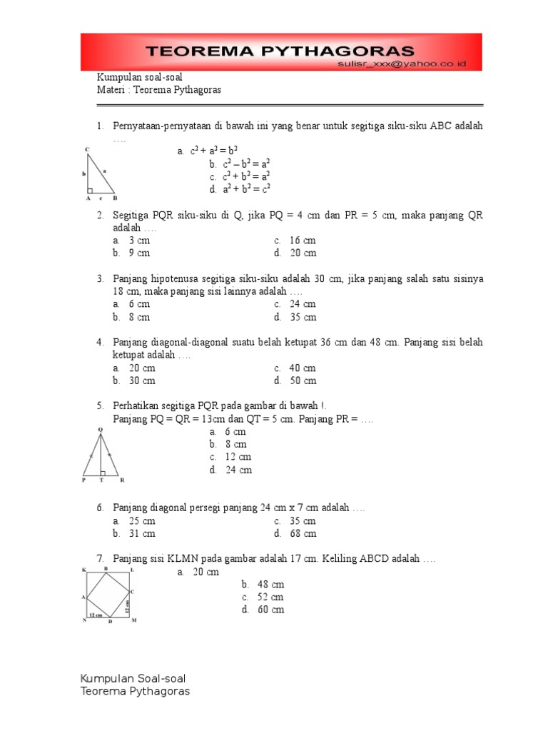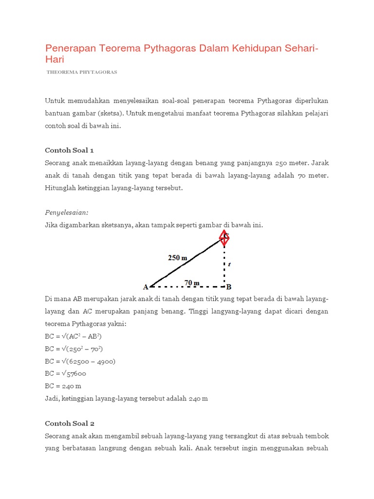 Contoh soal teorema pythagoras. Dalam dalil atau teorema pythagoras ada pola angka yang perlu untuk diingat supaya dalam menyelesaikan soal pythagoras akan lebih mudah dan cepat dalam mengerjakannya pola tersebut adalah sebagai berikut. Rumus phytagoras dalam bentuk akar. Dengan catatan angka terbesar merupakan sisi miring. Pada teorema pythagoras ada pola angka yang dapat kita hafal untuk memudahkan kita menjawab soal bahkan tanpa perhitungan. Selain dalam matematika phytagoras juga digunakan dalam bidang ilmu lainnya seperti fisika astronomi dan lain sebagainya. Contoh soal pythagoras pitagoras dan penyelesaiannya.