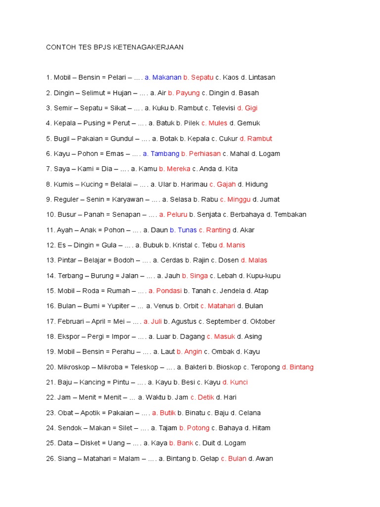 Contoh soal tes bpjs kesehatan. Kumpulan soal dan jawaban atau pembahasan psikotes yang bisa membantu untuk persiapan tes masuk kerja khususnya di bpjs ketenagakerjaan dan bpjs kesehatan. Dapatkan kisi kisi contoh soal psikotes cpns siap menghadapi ujian dan test cpns 2019 gratis download soal cpns 2019 kunci jawaban pdf soal cat scan lengkap 2019. Psikotes dasar di 2020 psikologi matematika kunci. Contoh soal tpa beasiswa djarum 2018 anda sedang mempersiapkan diri menghadapi ujian atau tes seleksi lowongan kerja bpjs kami sarankan untuk lebih banyak lagi mempelajari contoh contoh soal tpa dan pilihlah tempat yang sangat terpercaya dan memiliki penghargaan berupa tertimoni dari pelanggan yang sudah lulus tpa. Berikut ini adalah contoh soal tes potensi akademik bpjs kesehatan yang bisa anda unduh secara gratis dengan menekan tombol download yang ada pada tautan dibawah ini. Itulah yang dapat kami bagikan terkait contoh soal tes online bpjs ketenagakerjaan pdf.