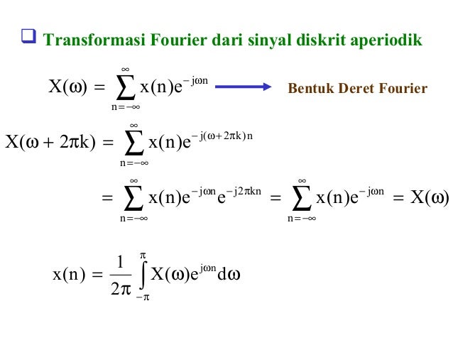Contoh soal deret fourier dan pembahasannya contoh soal deret fourier dan pembahasannya jumat 16 agustus 2019 0506 informasi lowongan yang anda cari adalah contoh soal deret fourier dan pembahasannyaberikut ini kami telah menyajikan beberapa artikel artikel yang berkaitan dengan contoh soal deret fourier dan pembahasannya. Koefisien deret fourier untuk isyarat kotak diskret dengan 2n115 dan a n10 b n20 dan c n40. Contoh soal 78 tentukan transformasi fourier dari sinyal diskrit. Untuk kasus sinyal non periodik kita gunakan formula yang disebut transformasi fourier.