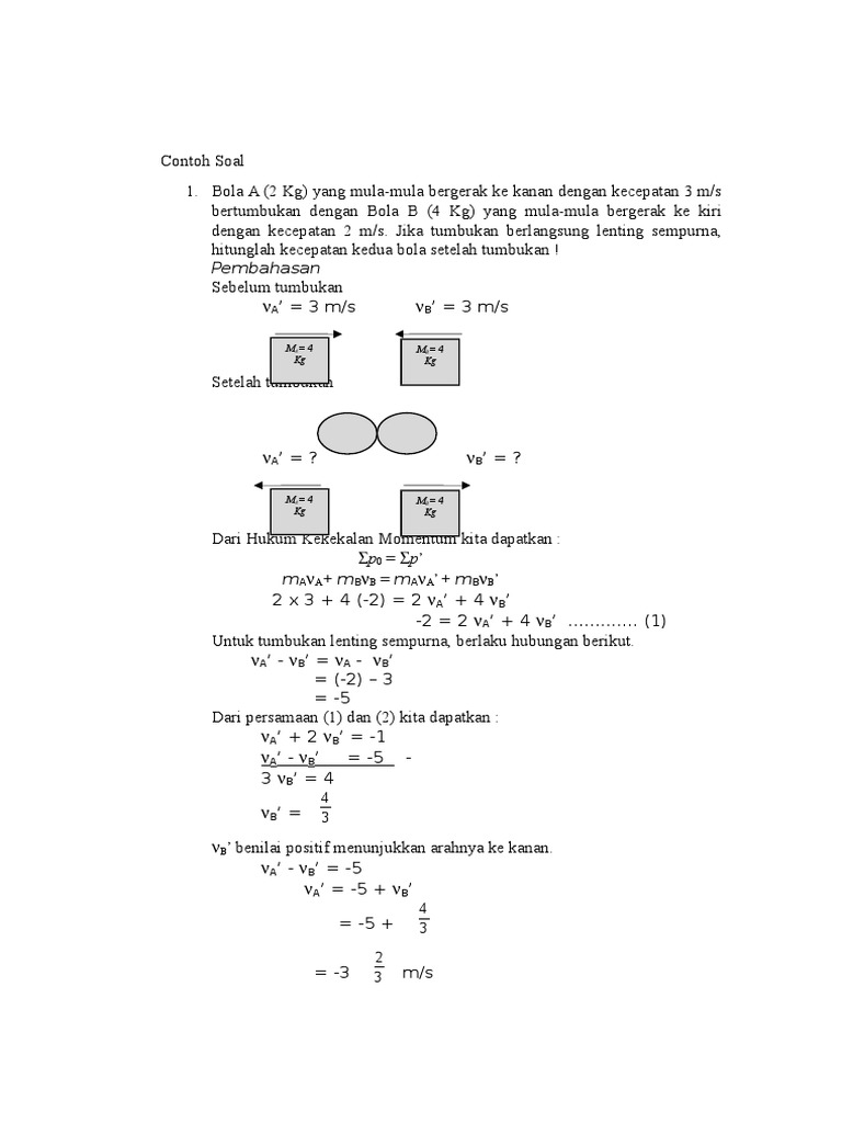 Contoh soal tumbukan tidak lenting sama sekali. Pergerakan bola dan plastisin menyatu dan bergerak bersama sama maka tetap berlaku hukum kekekalan momentum namun hukum kekekalan energy kinetik tidak berlaku dalam peristiwa jenis ini. Dengan menggunakan hukum kekekalan momentum dan hukum kekekalan energi kita dapat menentukan peristiwa yang terjadi setelah tumbukan. Sebutir peluru bermassa 30 gram bergerak dengan kecepatan sebesar 30 ms menumbuk balok kayu bermassa 1 kg yang sedang diam. Tumbukan tidak lenting sempurna merupakan sebutan lain dari tumbukan tidak lenting sama sekali. Contoh soal tumbukan tidak lenting sama sekali. Sebuah peluru bermassa 20 gram ditembakkan mengenai sebuah balok pada ayunan balistik yang massanya 1 kg.