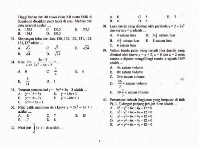 Contoh soal un matematika smk 2014 dan pembahasannya. Berikut ini adalah soal latihan ukg 2015 smk semua bidang yang merupakan kumpulan file dari berbagi sumber smkuji kompetensi guruukg 2015 tentang soal un matematika smk pariwisata 2014 dan pembahasannya. Berikut terdapat 40 contoh soal un smp yang dapat adik pelajari di rumah. Sebagaimana hasil un sma hasil un atau unbk smk tahun 2020 tahun pelajaran 20192020 juga masih digunakan sebagai salah satu pertimbangan untuk melanjutkan studi ke perguruan tinggi baik yang masuk melalui seleksi sbmptn atau snmptn apalagi jika masuk melalui jalur beasiswa seperti bidikmisi dan lainnyaoleh karena itu para siswa smk harus berusaha memaksimalkan hasil un atau unbk smk tahun. Soal un matematika sma ips 2014 dan pembahasannya. Berikut ini adalah kumpulan arsip soal asli un smk 2014 yang bisa didownload di blog berbagi dan belajarsoal soal un smk 2014 ini bisa diunduh dengan mengklik link download yang ada di bawah atau dengan mengklik gambar cover soal un smk 2014 yang ada pada posting artikel blog ini. Inilah soal un matematika smk pariwisata 2014 dan pembahasannya.