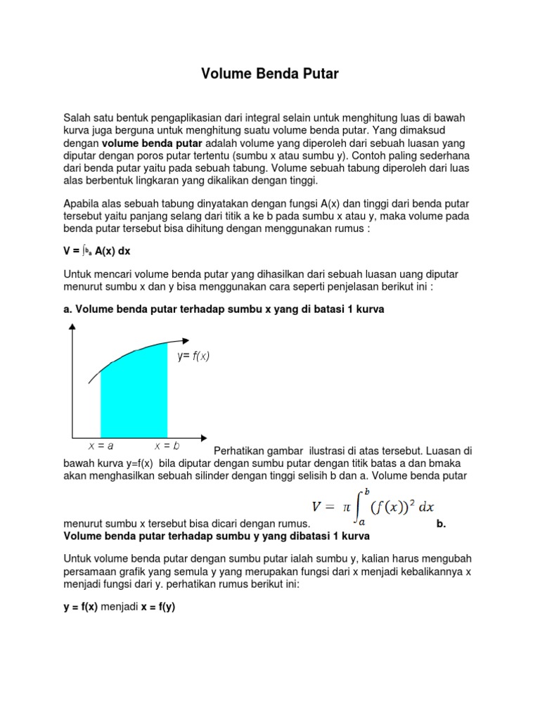 Pengertian rumus dan contoh soal volume benda putar beserta pembahasan lengkap salah satu bentuk pengaplikasian dari integral selain untuk menghitung luas di bawah kurva juga berguna untuk menghitung suatu volume benda putar. Salah satu bentuk pengaplikasian integral selain menghitung luas di bawah kurva juga untuk menghitung volume pada benda putar. Contoh paling sederhana dari benda putar. Volume benda putar volume yang dihasilkan dari sebuah luasan yang diputar dengan poros putar tertentu sumbu x sumbu y. Rumus volume benda putar dan contoh soal salah satu bentuk pengaplikasian integral selain untuk menghitung luas di bawah kurva juga untuk menghitung volume benda putar. Di sini kamu akan belajar tentang volume benda putar terhadap sumbu x melalui video yang dibawakan oleh bapak anton wardaya.