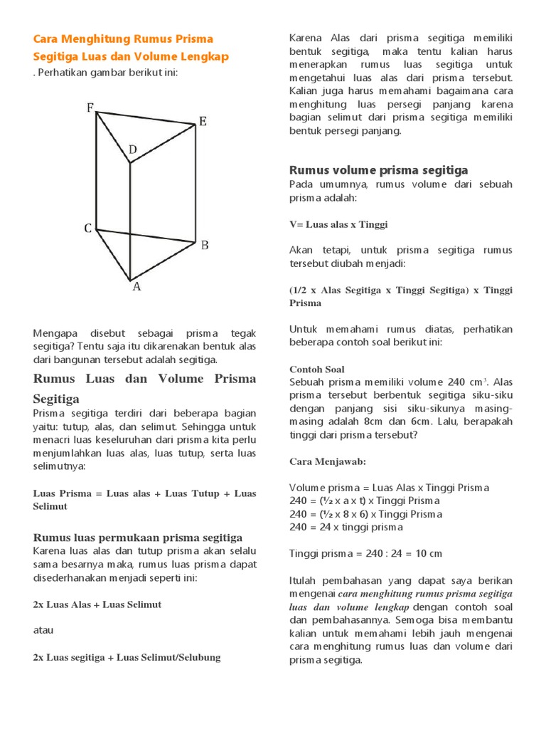 240 ½ x 8 x 6 x tinggi prisma. Demikian contoh soal dan pembahasannya tentang volume prisma. Soal bangun ruang prisma segitiga ini terdiri dari 20 soal pilihan ganda dan 10 soal uraian. 240 ½ x a x t x tinggi prisma. Pada kali ini kita akan melanjutkan kembali pembahasan kita yaitu tentang rumus prisma segitiga yang meliputi. Silahkan baca juga contoh soal dan pembahasan volume limasmohon maaf jika ada kesalahan kata maupun perhitungan dari postingan di atas.