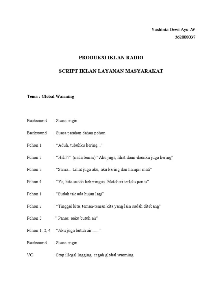 Terdapat beberapa kriteria yang dimiliki oleh iklan layanan masyarakat diantaranya adalah. Tugas iklan menyampaikan informasi tentang produk atau jasa sekaligus menawarkan kepada konsumen. Script naskah company profile. Anda di halaman 1 dari 1. Baik itu iklan komersial maupun non komersial tujuannya sama yaitu untuk mengajak masyarakat untuk memakai suatu produk atau merupakan ajakan untuk melakukan kebiasaan baik.