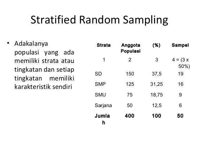 126 menyatakan bahwa starrified random sampling biasa digunakan pada populasi yang mempunyai susunan bertingkat atau berlapis lapis. Selamat sore sahabat blogger salam blogger indonesia yak pada postingan kali ini saya ingin berbagi sedikit contoh dari teknik stratified random sampling kemarin kebetulan dapat bagian membahas mengenai teknik sampling berstrata. Teknik sampling ini juga mirip random sampling. Disproportionate stratified random sampling disproporsional stratified random sampling adalah teknik yang hampir mirip dengan proportionate stratified random sampling dalam hal heterogenitas populasi. Elemen populasi dibagi menjadi beberapa tingkatan stratifikasi berdasarkan karakter yang melekat padanya. Contoh kasus stratified random sampling suatu biro iklan ingin mengindetinfikasi jenis iklan apa yang cocok diberikan di suatu wilayah.