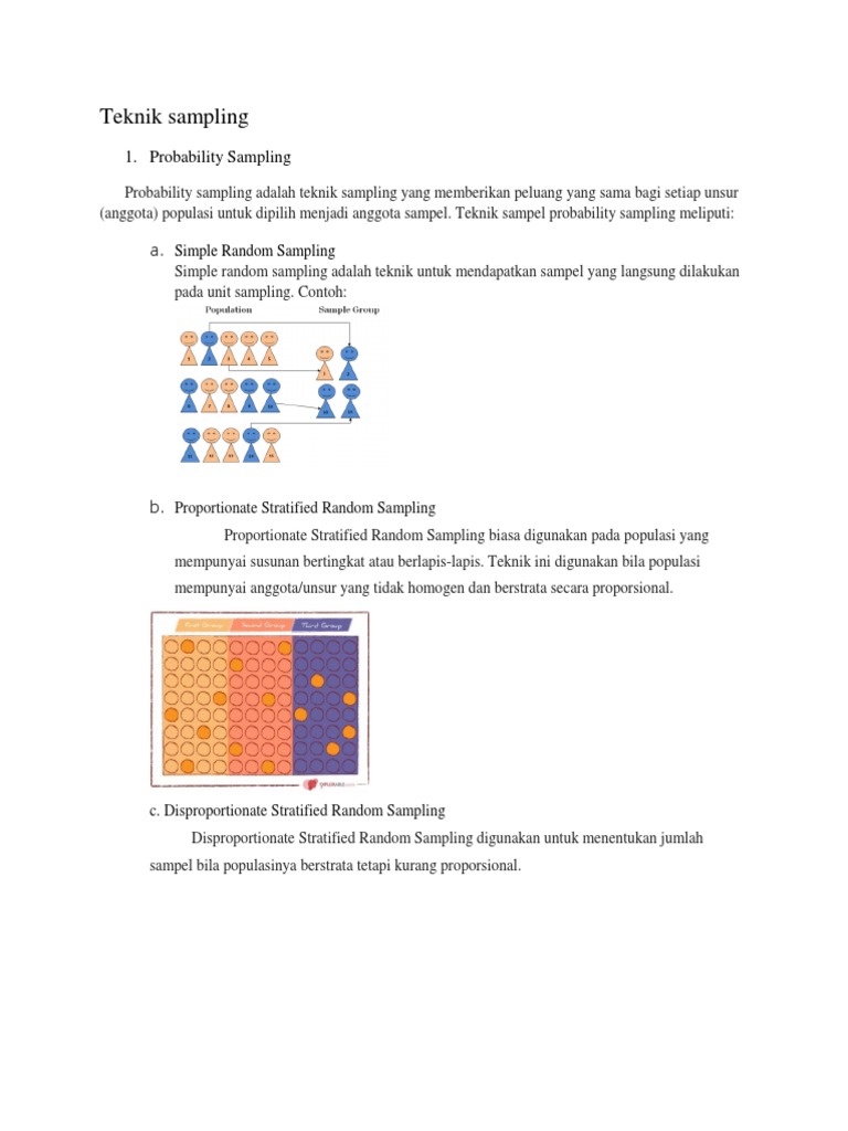 Sedangkan nonprobability sampling adalah teknik pengambilan sampel yang tidak memberi peluang atau kesempatan sama bagi setiap unsur atau anggota populasi untuk dipilih menjadi sampel. Metode stratified random sampling adalah salah satu teknik yang digunakan untuk mengambil sampel dengan berdasarkan pada tingkatan tertentu.