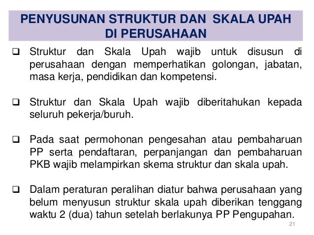 Pemerintah ri berdasarkan permenaker no. Pihak perusahaan telah membuat struktur dan skala upah namun belum mengacu sepenuhnya kepada ketentuan penyusunan struktur dan skala upah dalam kep 49meniv2004. Berikut langkah langkahnya menyusun struktur dan skala upah.