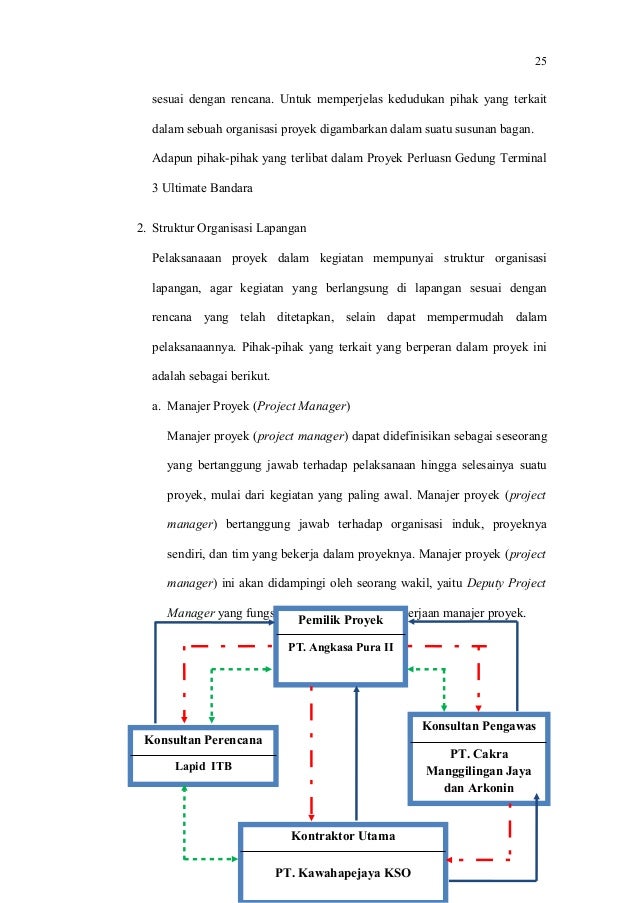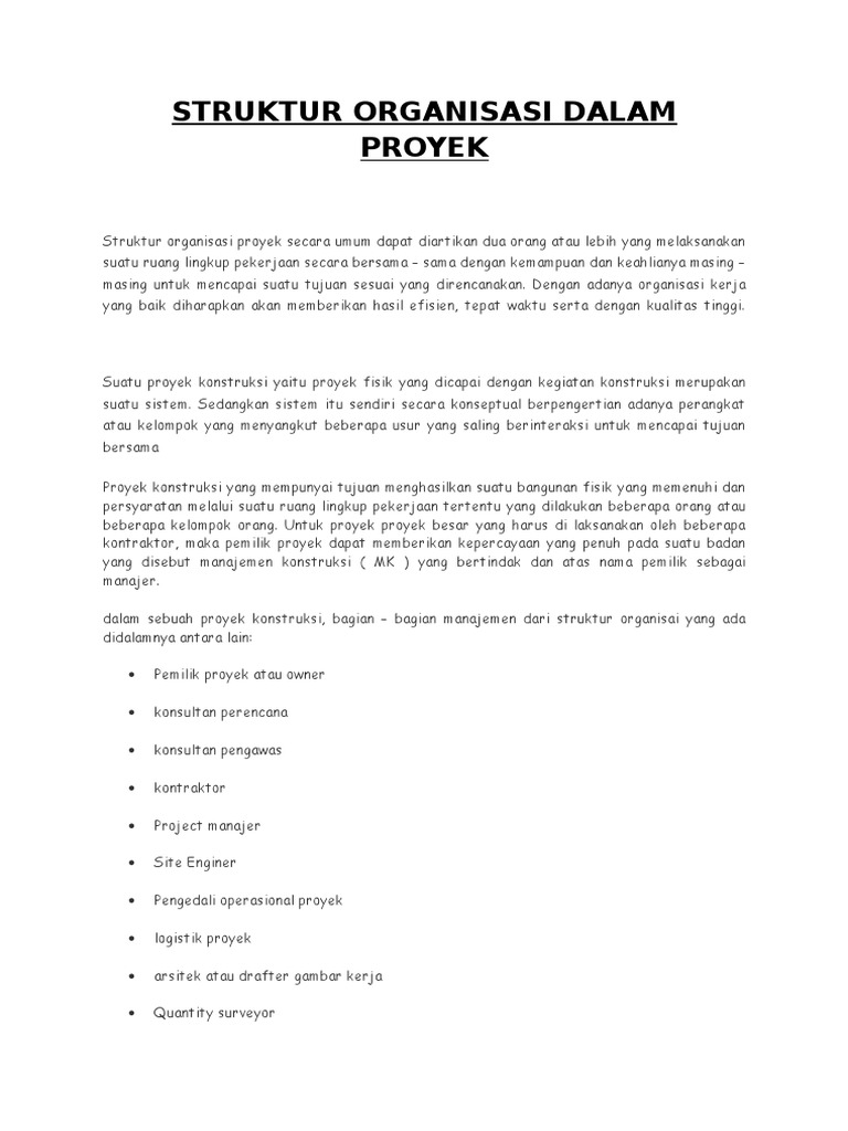 Seluruh bagian dalam organisasi proyek adalah satu kesatuan secara utuh yang apabila salah satu tidak bekerja dengan baik maka dapat mempengaruhi kelancaran proses pelaksanaan proyek misalnya apabila bagian. Untuk suksesesnya suatu proyek diperlukan struktur organisasi yang sesuai. Manajemen proyek dan organisasi proyek. Untuk itu ada beberapa jenis struktur organisasi proyek kontraktor yaitu. Berdasarkan hubungan kontrak perjanjian kerjasamanya struktur organisasi berdasarkan hubungan kontrak perjanjian kerjasamanya mengatur hubungan pihak pihak yang terlibat dalam proyek misalnya. Hal ini berguna agar mengetahui hak dan kewajiban serta batasan dari setiap jabatan.