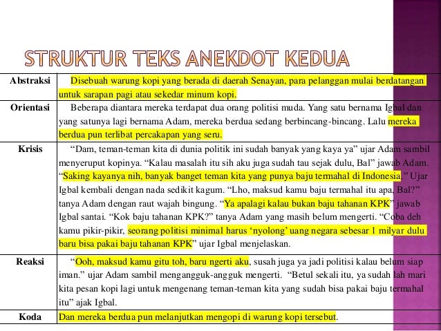 Contoh struktur teks anekdot. Pada suatu hari seperti biasa dari pagi sampai siang tukang kupat tahu berdagang di smp 4 tasikmalaya. Pembeli terakhirnya membeli kupat tahu di sisi rel kereta. Berikut ini adalah penjelasan mengenai struktur teks anekdot. Jam 12 siang dia biasanya menyusuri rel kereta untuk mengambil jalan pintas menuju ke lokasi dagang selanjutnya yakni pasar pancasila. Teks tersebut singkat tapi kelucuannya dapet banget sehingga saya sangat suka dengan lelucon yang seperti itu. Abstraksi merupakan bagian awal paragraf yang berfungsi untuk memberikan suatu gambaran yang jelas tentang isi dari teks anekdot.
