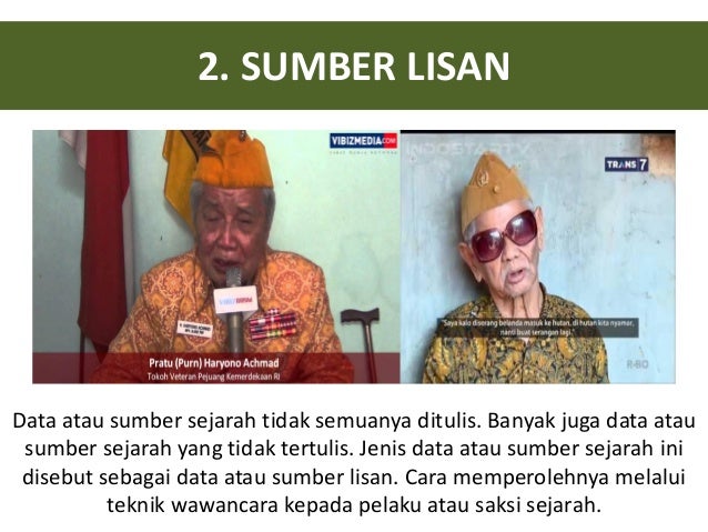Tradisi lisan biasanya digunakan untuk mengumpulkan sumber sumber sejarah yang tidak ada dokumentasinya dengan cara mewawancarai orang orang yang terkait dengan peristiwa tersebut. Bila dilihat dari bentuknya maka terdapat sumber tertulis sumber lisan dan sumber dalam wujud benda fisiik atau artefak5 contoh sejarah sumber tertulis adalah sebagai berikut. Sumber sejarah semacam ini disebut sebagai sumber lisan. Dalam meneliti suatu peristiwa di masa lampau dibutuhkan jenis jenis sumber sejarah baik dalam bentuk tulisan lisan visual dan sebagainya. Dilihat dari sifatnya sumber sejarah bisa dikategorikan ke dalam dua bentuk yaitu adalah sumber primer dan sumber sekunder. Jadi lebih banyak pengalaman tokoh yang bersangkutan dalam peristiwa sejarah.