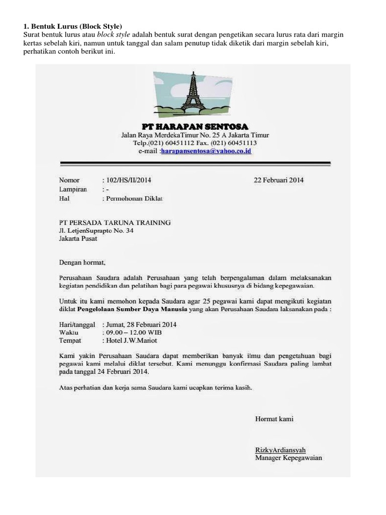 Contoh surat bentuk lurus. Contoh dan bagan 13 maret 2020 0 mursiati administrasi perkantoran sma smk di dalam surat menyurat format atau bentuk surat adalah salah satu hal yang perlu untuk diperhatikan. Jadi surat dengan model full block style memiliki bentuk atau susunan yang lurus dari atas sampai bawah. Bentuk semi block style bentuk surat semi block style atau bentuk setengah lurus adalah salah satu bentuk surat yang penulisannya hampir sama dengan bentuk lurus block style perbedaannya terletak pada pengetikan isi saja yaitu setiap alenia baru masuk lima spasi. Apa itu surat bentuk lurus block style. Salah satunya adalah bentuk lurus penuh walaupun terbilang jarang dipergunakan dalam dunia pekerjaan ataupun urusan surat menyurat. Bentuk surat lurus atau surat bentuk block style ini mirip dengan bentuk surat lurus penuhhanya perbedaannya terletak pada penempatan penulsian tanggal surat salam penutup nama penanda tangan dan jabatan penanda tangan yang ditempatkan di bagian kanan surat.
