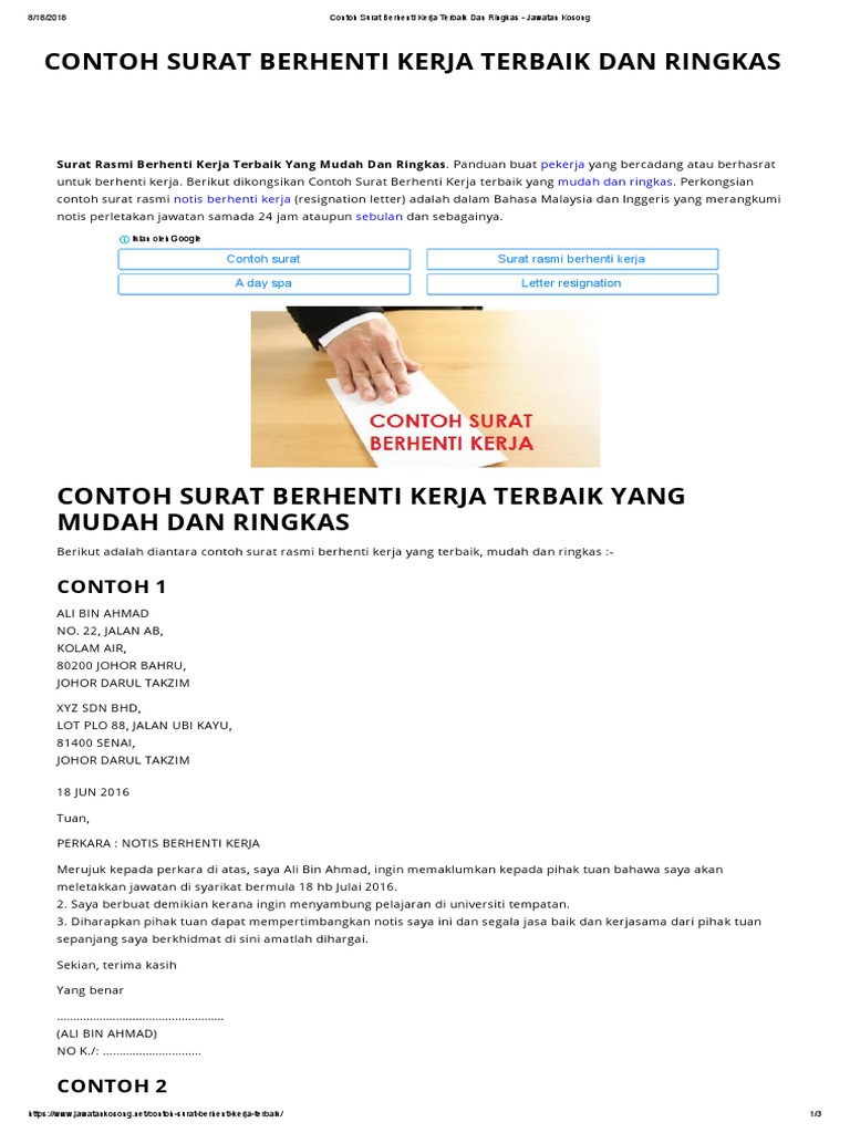 Contoh Surat Berhenti Kerja Dalam Bahasa Melayu Semuanya Contoh