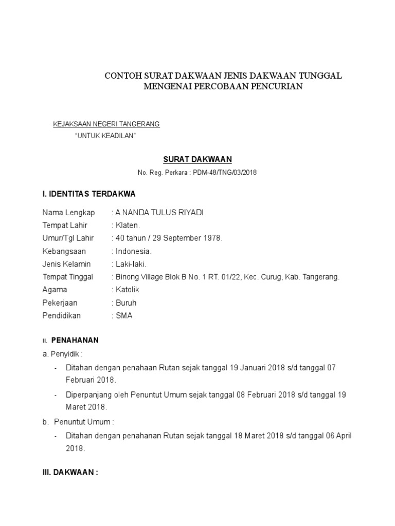 Contoh surat dakwaan lengkap 1. Identitas terdakwa nama lengkap. Dalam bentuk surat dakwaan ini antara lapisan satu dengan yang lainnya menggunakan kata sambung atau. Contoh surat dakwaan kasus pencurian kejaksaan negeri banyuwangi p 29 untuk keadilan. Pemilihan bentuk surat dakwaan apakah disusun secara tunggal alternatif subsidairitas ataupun kombinasi merupakan kewenangan penuh dari tim penuntut umum.