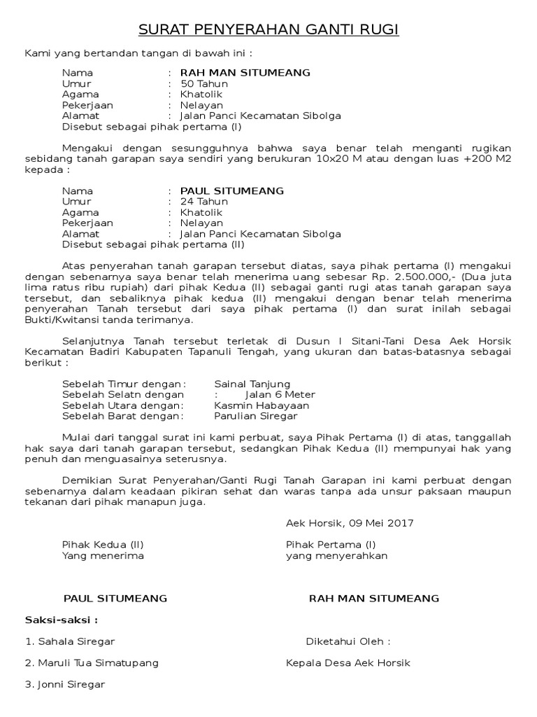Contoh surat ganti rugi tanah. 3000000 tiga juta rupiah bayar tunaitanah lokasi tersebut di dusun i ladoa desa lantawonua kecamatan rumbia tengah kabupaten bombana dengan batas batas sebagai. Shietra partners mensinyalir besaran ganti rugi tidak berupa surat keputusan ataupun dalam bentuk penetapan pejabat daerahdisinilah celah hukum bagi oknum aparatur bermain dan memancing di air keruh. Bahwa pihak pertama telah menyerahkan sebidang tanah termaksud tanaman yang tumbuh di dalam lokasi tersebut seluas panjang 13 m x 7 m 91 m 2 kepada pihak kedua untuk dimiliki seterusnya dengan harga ganti rugi sebanyak rp. Surat perjanjian ganti rugi tanah ini biasanya diajukan kepada pihak pemerintah jika pemerintah berencana membeli lahan milik anda untuk kepentingan pembangunan sarana prasarana umum. Bila dasarnya hanyalah nominal yang tercantum dalam dokumen hasil penilaian penilai appraisal maka besaran estimasi harga hak atas tanah akan terbagi menjadi dua kelompok. Contoh surat ganti rugi tanah admin sampaikan contoh surat ganti rugi tanah untuk anda yang ingin membuat contoh surat ganti rugi tanah karena kami menyampaikan format contoh surat ganti rugi tanah lengkap dan kami berikan dibawah supaya anda bisa men contoh surat ganti rugi tanah ini.