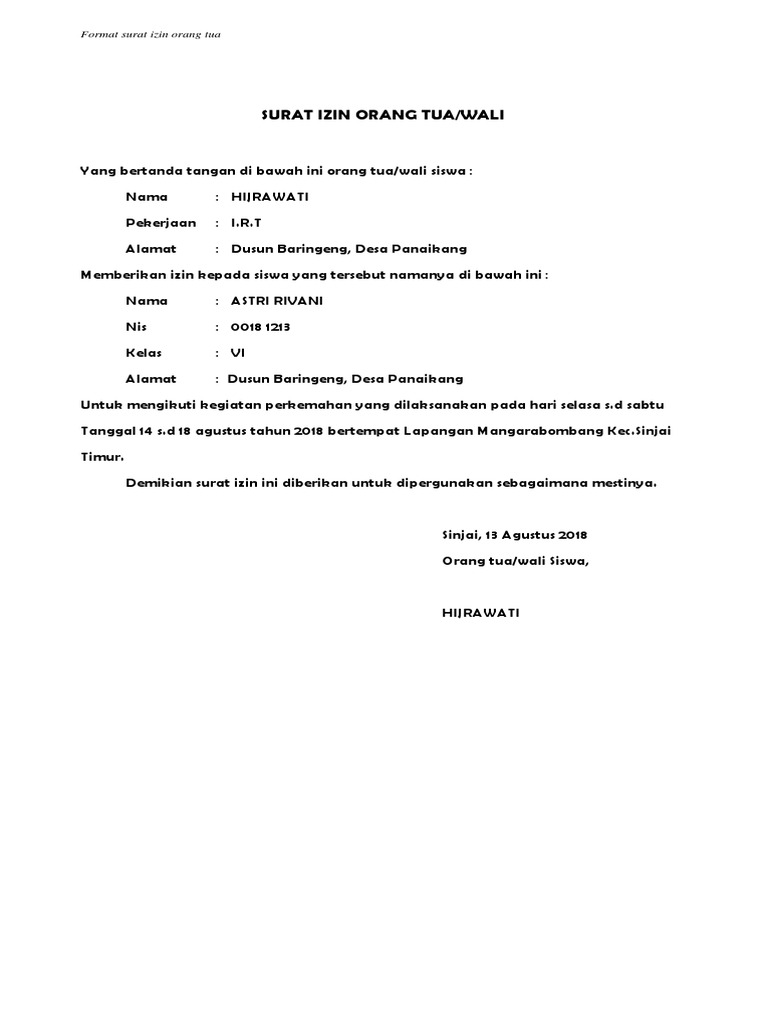 Contoh surat izin orang tua untuk mengikuti kegiatan perkemahan. Demikian surat ini kami sampaikan atas perhatian dan kerjasamanya kami ucapkan terima kasih. Tidak heran kalau sudah semakin banyak orang meninggalkan penggunaan surat sebagai media komunikasi. Sangat cocok untuk kamu jadikan referensi. Sehubungan dengan kegiatan tersebut diatas maka pihak sekolah memohon kepada bapak dan ibu orang tuawali murid untuk memberikan ijin kepada putraputrinya untuk mengikuti kegiatan tersebut. Dan untuk mengikuti kegiatan tersebut tidak jarang kita dimintai oleh guru pembimbing untuk mendapat restu orang tua maka dari itu pihak sekolah sudah semestinya mempersiapkan surat yang akan diedarkan kepada wali murid agar kegiatan dapat berlangsung sesuai harapan guru dan wali murid. Contoh surat izin orang tua untuk mengikuti kegiatan pramuka ada kalanya kita mengikuti sebuah kegiatan yang memerlukan izin dari orang tua.