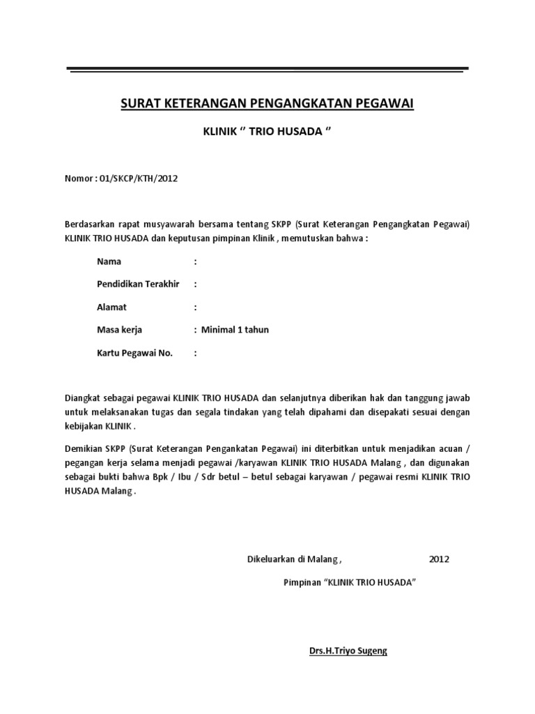 Lompat ke halaman. Anda di halaman 1 dari 1. Contoh surat pengangkatan karyawan surat pengangkatan karyawan adalah surat yang diterbitkan dan diputuskan oleh pihak perusahaan atas tujuan pengangkatan karyawan staff maupun posisi jabatan tertentu. Contoh surat pengangkatan karyawan. Contoh surat keputusan pengangkatan karyawan tetap. Sekian dulu penjelasan singkat mengenai contoh surat pengangkatan karyawan yang dapat kami jelaskan.