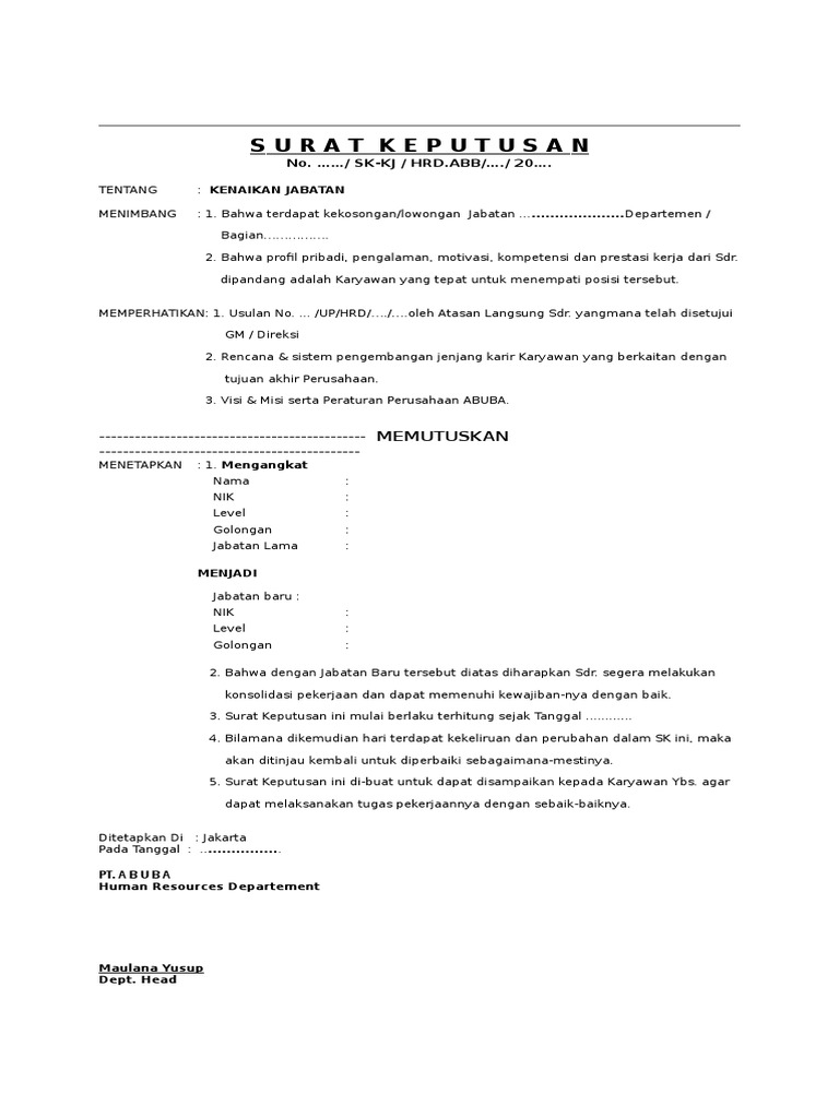 Contoh surat pemberitahuan merumahkan karyawan ketika perusahaan mengalami berbagai macam kendala keuangan maka mau tidak mau harus mengambil suatu keputusan atau tindakan meskipun amatlah pahit. Download contoh surat keputusan doc. Contoh surat keputusan sk pengangkatan karyawan tetap ketika seorang karyawan borongan karyawan tidak tetap dinilai berprestasi dan memenuhi kriteria yang diinginkan perusahaan maka dapat diangkat menjadi karyawan tetap. Jenis surat pengangkatan karyawan tetap merupakan surat keputusan yang dikeluarkan oleh perusahaan untuk karyawan yang bersangkutan. 15 contoh surat keputusan yang baik dan paling lengkap dalam suatu instansi perusahaan lembaga organisasi maupun beberapa kelompok lainnya tentu akan pernah menggunakan salah satu contoh surat yang satu ini yakni surat keputusan. Surat keputusan diperlukan bilamana seorang pemimpin atau atasan membuat.