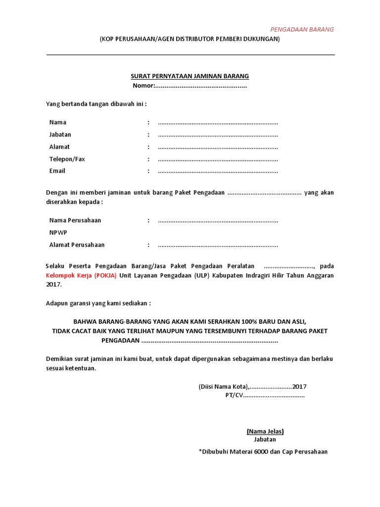 Pada zaman serba modern ini manusia semakin mudah lupa. Surat pernyataan ini harus ditandatangani oleh pengurus perusahaan yang tercantum dalam akte perusahaan terakhir pada saat ditandatangani. Barang danatau jasa dalam proses pengadaan barang danatau jasa di lingkungan pt. Surat perjanjian pengadaan barang proyek pengadaan barang merupakan salah satu tipe proyek yang banyak beredar di perkantoran maupun gedung pemerintahan. Yang bertanda tangan dibawah ini. Diatas kop penyedia barang.