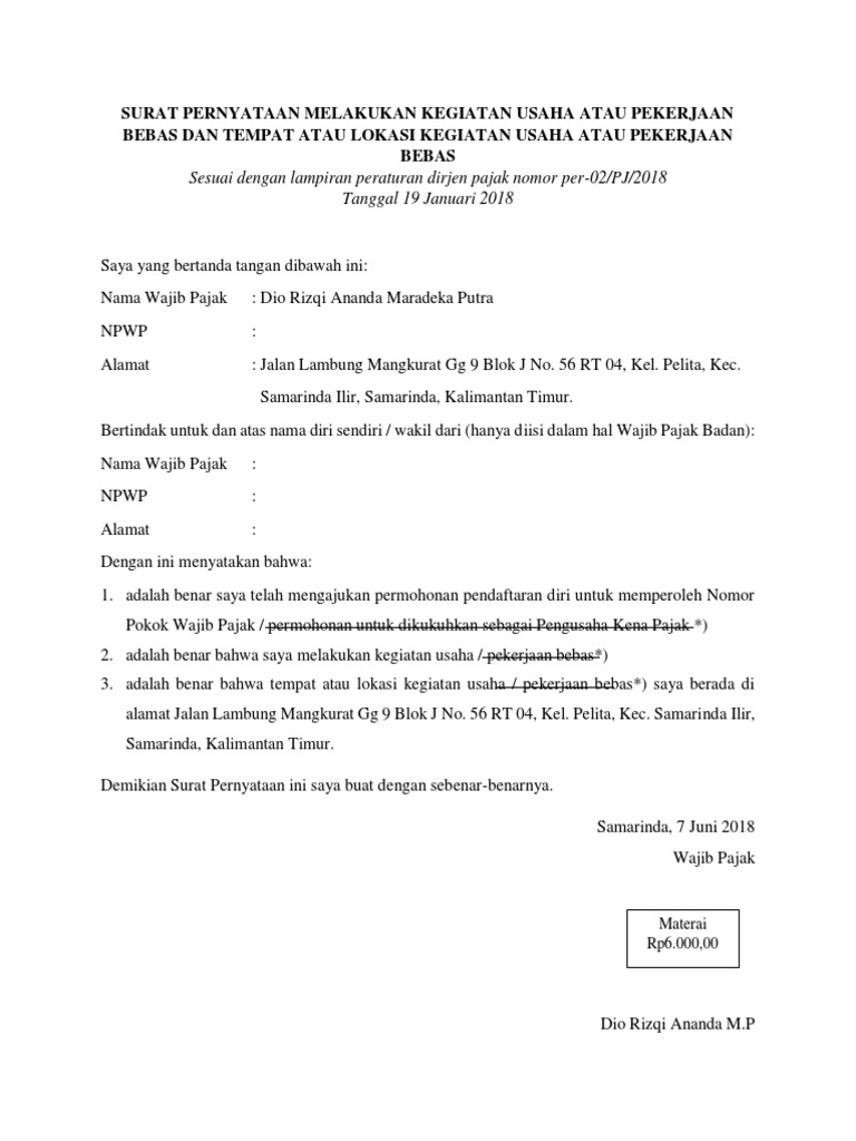 Contoh surat keterangan bebas pajak. Surat keterangan bebas pemotongan pemungutan pph 21 pph 22 pph 23 bagi wajib pajak yang memiliki peredaran bruto tertentu berdasarkan peraturan pemerintah nomor 46 tahun 2013. Pernyataan yang bertandatangan di bawah ini diikuti beberapa keterangan. Keterangan adanya manfaat surat keterangan ini dapat kita baca pada peraturan menteri keuangan nomor 99pmk032018 tentang pelaksanaan peraturan pemerintah nomor 23 tahun 2018 tentang pajak penghasilan atas penghasilan dari usaha yang diterima atau diperoleh wajib pajak yang memiliki peredaran bruto tertentu. Pengertian dan penetapan skb ppn. Berisi keterangan atas jabatan pihak yang namanya tertulis di bagian atas. Berisi nama pihak yang mengajukan keterangan bahwa dirinya bukan pengusaha kena pajak.