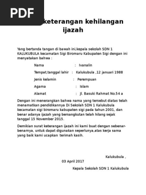 Bandung 19 april 2016. Contoh surat surat keterangan hilang barang mild. Kehilangan dokumen atau surat surat berharga dapat dialami oleh siapa saja. Contoh surat keterangan hilang ijazah terbaru ini di buat dengan menggunakan microsoft word sehingga dapat bapak ibu guru edit sesuai dengan kebutuhan. Contoh surat pernyataan kehilangan kehilangan sebuah surat atau dokumen penting memang sering terjadi. Contoh surat keterangan pip kip bsm untuk siswa dari kepala sekolah setelah mendapatkan informasi dari guru wali kelas bahwa ada orang orang tua wali siswa yang meminta surat keterangan program indonesia pintar atau yang sejenisnyamaka pihak sekolah atau kepala sekolah harus siap mengeluarkan membuat surat yang sesuai diminta oleh orang tua wali siswa.