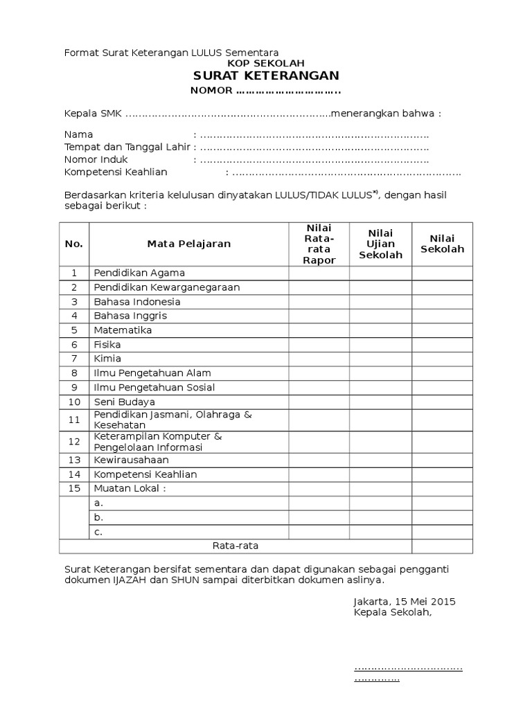 Contoh surat keterangan kelulusan sementara. Setelah pengumuman kelulusan peserta didik kelas 9 smpmts tahun 20152016 telah dilaksanakan di setiap satuan pendidikan pada hari sabtu 11 juni 2016 selanjutnya perlu diterbitkan surat keterangan hasil ujian nasional yang bersifat sementara sebelum terbit surat hasil ujian nasional dan ijazah smpmts di tahun pelajaran 20152016 nantinya. Tanggal pengumuman kelulusan tetap mengacu pada surat dirjen pendis nomor b6861 tahun 2020 point 4d4 yang ma a tanggal kelulusan ini akan dicantumkan pd blangko ijazah siswa. Dan untuk lebih memudahkan silahkan diunduh melalui tautan berikut. Contoh surat keterangan lulus sekolah dasar. Format surat keterangan lulus 2020 sd smp sma smk by websiteedukasi posted on may 15 2020 may 15 2020 websiteedukasi download surat keterangan kelulusan sementara terbaru untuk jenjang sd smp sma dan smk tahun pelajaran 2019 2020 format word docdocx. Jika anda baru berprofesi sebagai staf tu sekolah dan ingin membuat surat keterangan lulus sementara maka contoh surat di atas silahkan anda pergunakan sebagai referensi dan rujukan dalam pembuatannya.