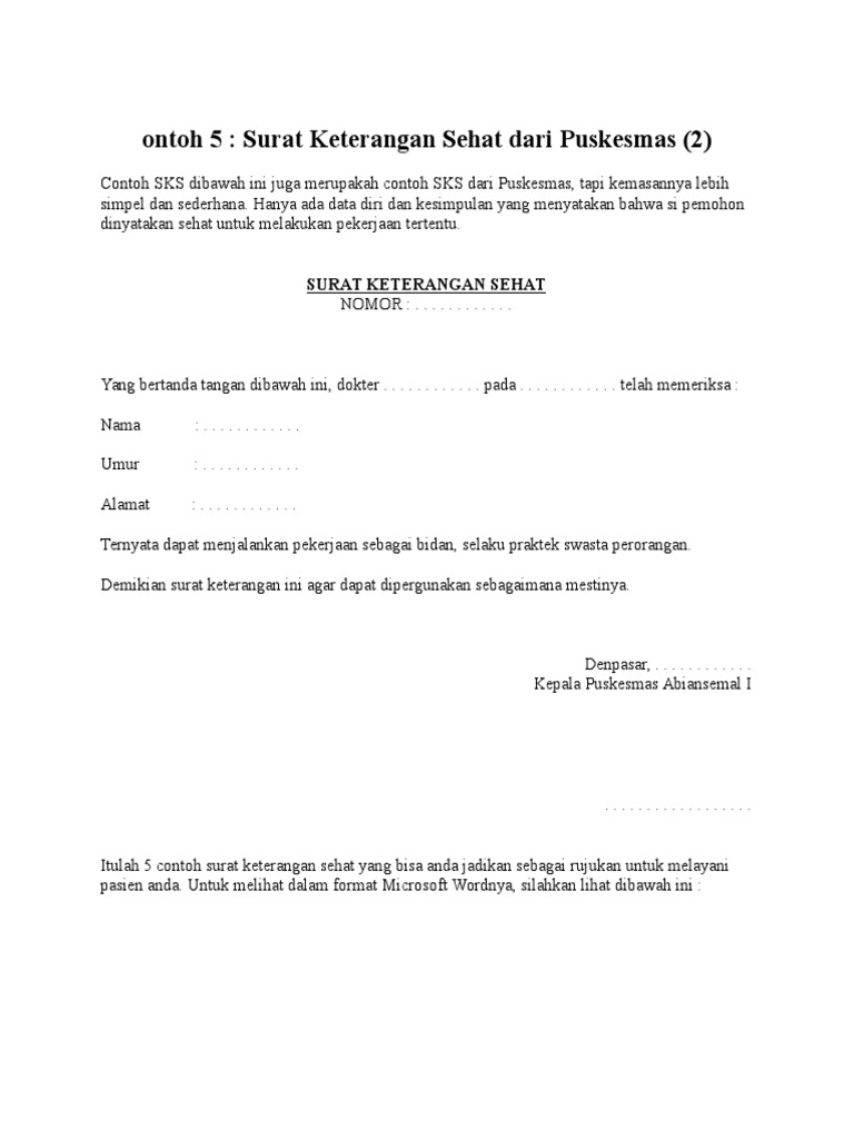 Penting untuk diingat pastikan selalu ada tanda tangan dokter pemeriksa dan ada cap basah dari puskesmas ya. Itulah beberapa contoh surat keterangan sehat dari puskesmas untuk berbagai keperluan. Contoh surat keterangan sehat dari doktersurat keterangan sehat biasanya diterbitkan oleh dokter. Misalnya surat keterangan sehat surat keterangan bebas dari kriminalitas maupun surat keterangan pengalaman kerja. Surat keterangan berbadan sehat yang bisa dibuat di puskesmas dokter praktek dan rumah sakit. Jika anda ingin mendapatkan surat keterangan sehat tentunya anda harus menyiapkan beberapa persyaratan yang sudah ditetapkan agar supaya anda bisa mendapatkan surat ini.