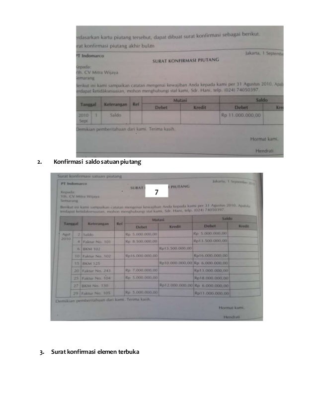 Contoh surat konfirmasi piutang tegaldlimo 14 juli 1996. Namun secara garis besar tentu mengandung unsur unsur yang sama. Surat konfirmasi piutang berdasarkan sifat suratnya 1 surat konfirmasi positif konfirmasi positif adalah surat konfirmasi yang dikirim oleh ankutan publik dimana debitur diminta mengirim balasannya kepada akuntasi publik baik jika setuju maupun tidak disetujuui atas saldo yang ada dalam surat tersebut. Menurut catatan kami saldo piutang kami ke pt antariksa per 31 desember 2007 adalah. Konfirmasi ini kami kirim untuk kepentingan auditor independen kami bukan untuk menagih piutang kami. Berikut kami sediakan format standar dari surat konfirmasi saldo piutang yang bisa anda jadikan contoh.