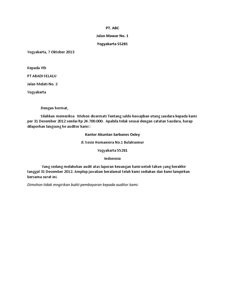 Pengirim surat tersebut juga mengirimkan formulir yang merupakan sarana untuk menuliskan pernyataan langsung dari pihak pt abc terkait dengan kecocokan antara catatan piutang dari perusahaan dengan catatan utang pt abc. Tujuan pembuatan surat konfirmasi piutang antara lain yaitu untuk mengingatkan kembali kepada pelanggan tentang utang yang dimiliki di perusahaan kita. Contoh surat perjanjian hutang piutang 3. 51 pada hari ini kamis 21 juni 2012 menghadap kepada saya frid hutagalung sarjana hukum notaris di jl. Kop surat perusahaan bandar lampung 20 september 2016. Auditing contoh surat konfirmasi positif dan negatif.