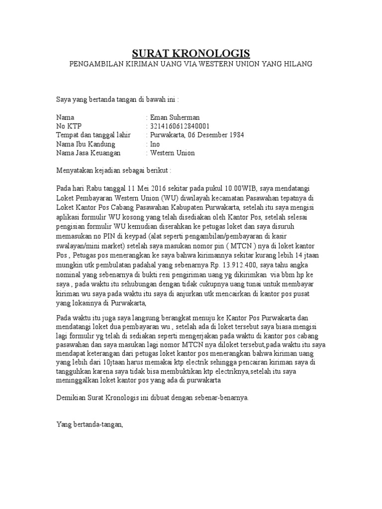 Contoh surat laporan kejadian. Contoh surat kronologis yang pertama ini adalah contoh surat yang pada umumnya digunakan untuk melaporkan suatu kejadian. Yang bertanda tangan di bawah ini. Mekanik kronoligis kecelakaannya adalah sebagai berikut. Saya mengendarai mobil berkecapatan 80 kmjam. Berikut contoh kronologi kematian.