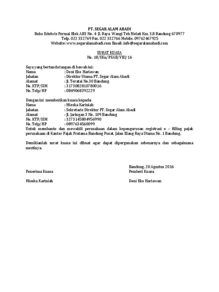 Untuk surat kuasa dari direksi ke pengurus untuk pembuatan efin wp badan apa ada formatnya. Namun sebelum ke inti dari topik bahasan akan saya bahas dulu sedikit tentang surat kuasa baik itu fungsinya maupun jenisnya.