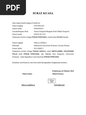 Contoh surat kuasa pdf. Surat kuasa adalah surat yang berisi pelimpahan wewenang dari seseorang atau pejabat tertentu kepada seseorang atau pejabat lain. Simpan simpan contoh surat kuasapdf untuk nanti 0 0 mendukung tandai dokumen ini sebagai bermanfaat 1 1 menolak tandai dokumen ini sebagai tidak bermanfaat tanamkan bagikan. Untuk dapat mendownload contoh surat kuasa perwakilan dalam format doc silahkan anda klik link dibawah ini. Contoh surat kuasa doc. Contoh surat kuasa banyak di cari di internet. Semoga dapat bermanfaat sekian dan terima kasih.