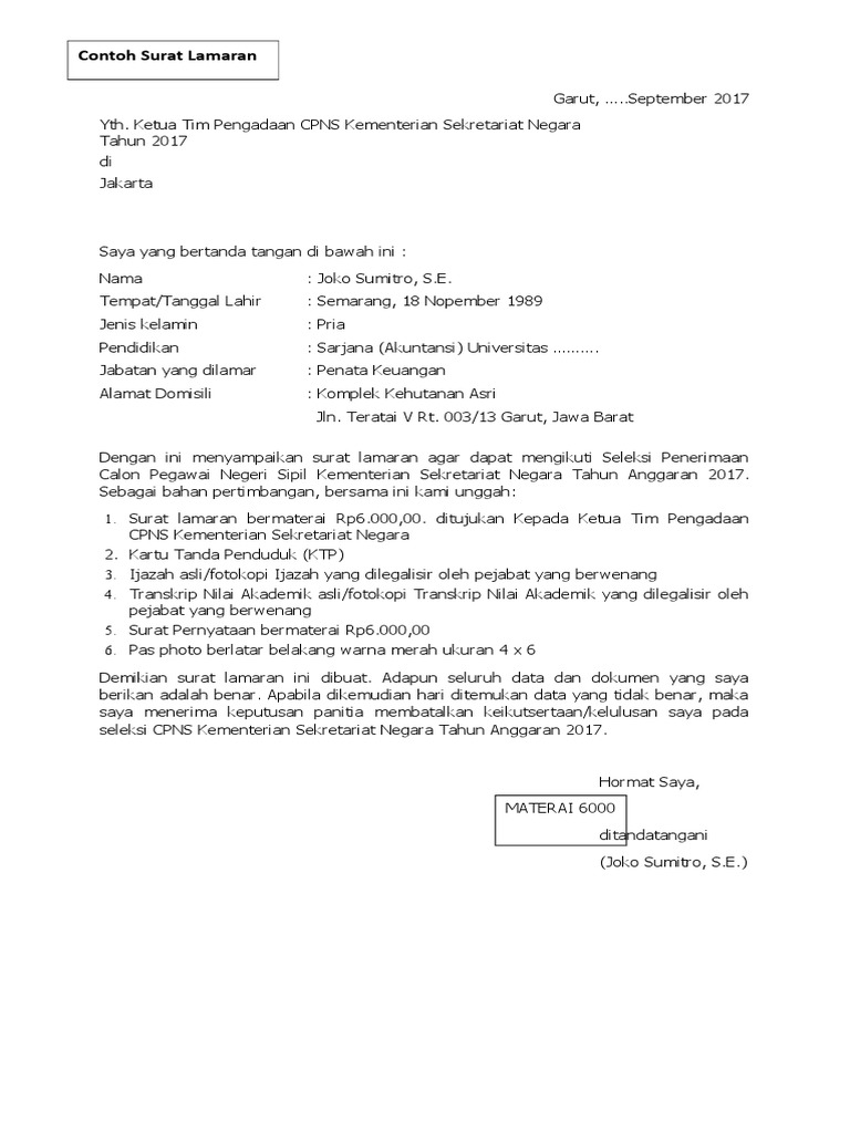 Contoh surat lamaran cpns 2017. Contoh surat lamaran kerja cpns terbaru 2015 buat anda yang ingin melamar kerja di cpns maka membuat surat lamaran tidak boleh asal buat saja dan ada setruktur yang harus anda ketahui juga maka dengan ini kami blog contoh surat dan proposal memberikan info ini buat anda semua supaya anda bisa di terima lamaran kerja cpns anda nantinya. Sebenarnya calon peserta seleksi cpns juga bisa mengunduh melalui images for contoh surat lamaran cpns 2018. Membuat surat lamaran cpns bagi yang belum pernah memang sedikit susah. Contoh surat lamaran cpns ini resmi saya kutip dari laman website kemenkumham. Meski baru calon contoh surat lamaran cpns ini tidak bisa dianggap remeh. Format contoh surat lamaran cpns 2019 di kemenkumham kemenag dan kemenlu bisa dilihat di bagian bawah artikel ini.