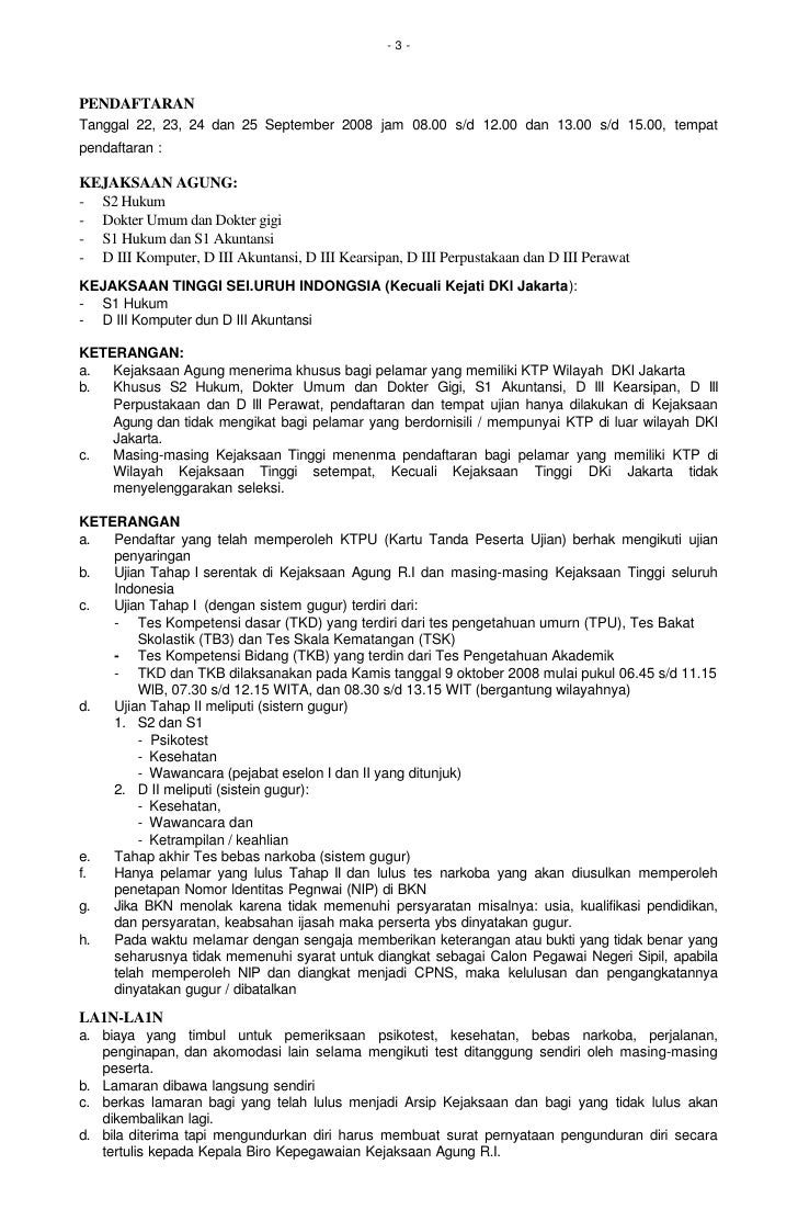Bersama dengan kemenkumham dan agensi lainnya kejaksaan agung membuka formasi sipir atau penjaga dengan jumlah cpns yang jumlahnya mencapai ribuan orang di seluruh indonesia. Surat lamaran cpns kejagung kejaksaan agung 2018 merupakan surat untuk melamar menjadi calon pegawai negeri sipil di lingkungan kerja kejagung kejaksaan agung. Contoh surat lamaran cpns tidak lama lagi pendaftaran cpns akan segera dibuka. N a m a.
