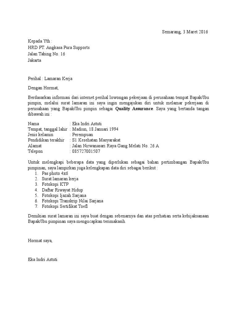 Angkasa pura i persero sesuai dengan latar belakang pendidikan saya. Surat lamaran kerja secara umum mencantumkan informasi terkait profil singkat pelamar beserta riwayat yang dimilikinya mulai dari pendidikan pekerjaan organisasi prestasi sertifikasi dan lain lain. Berikut ini contoh surat yang baik dan benar serta menarik perhatian yang dapat anda gunakan dalam tema maupun format penulisan surat. Dengan mengetahui kriteria dan kebutuhan rekrutmen yang telah dijelaskan diatas dengan demikian para pencari kerja yang merasa memenuhi persyaratan meliputi pendidikan umur dll dan memang merasa berminat dengan lowongan kerja terbaru pt angkasa pura i persero pada bulan januari 2020 diatas hendaknya secepatnya untuk melengkapi dan menyusun berkas lamaran kerja seperti surat lamaran kerja. Contoh surat lamaran kerja angkasa pura merupakan contoh gratis pada pembahasan contoh surat yang di posting oleh gawe cv. Angkasa pura i persero di tempat dengan hormat bersama ini saya bermaksud untuk melamar pekerjaan yang tersedia di pt.