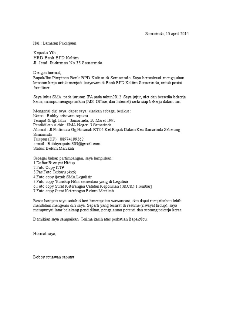 Contoh surat lamaran kerja di bank yang benar. Apabila anda membutuhkan referensinya silahkan langsung menuju postingan tersebut. Contoh surat lamaran kerja di bank berdasarkan bursa kerja job fair 4w5k9majygjj adalah contoh surat yang digunakan untuk melamar pekerjaan yang dikhususkan pada bank. Pada dasarnya tidak jauh berbeda hanya saja pada contoh surat lamaran kerja di bank ini di cantumkan nama bank tujuan tempat melamar kerja dan posisi yang dilamar. Yang membedakan hanya tujuannya yaitu untuk melamar kerja di bank.