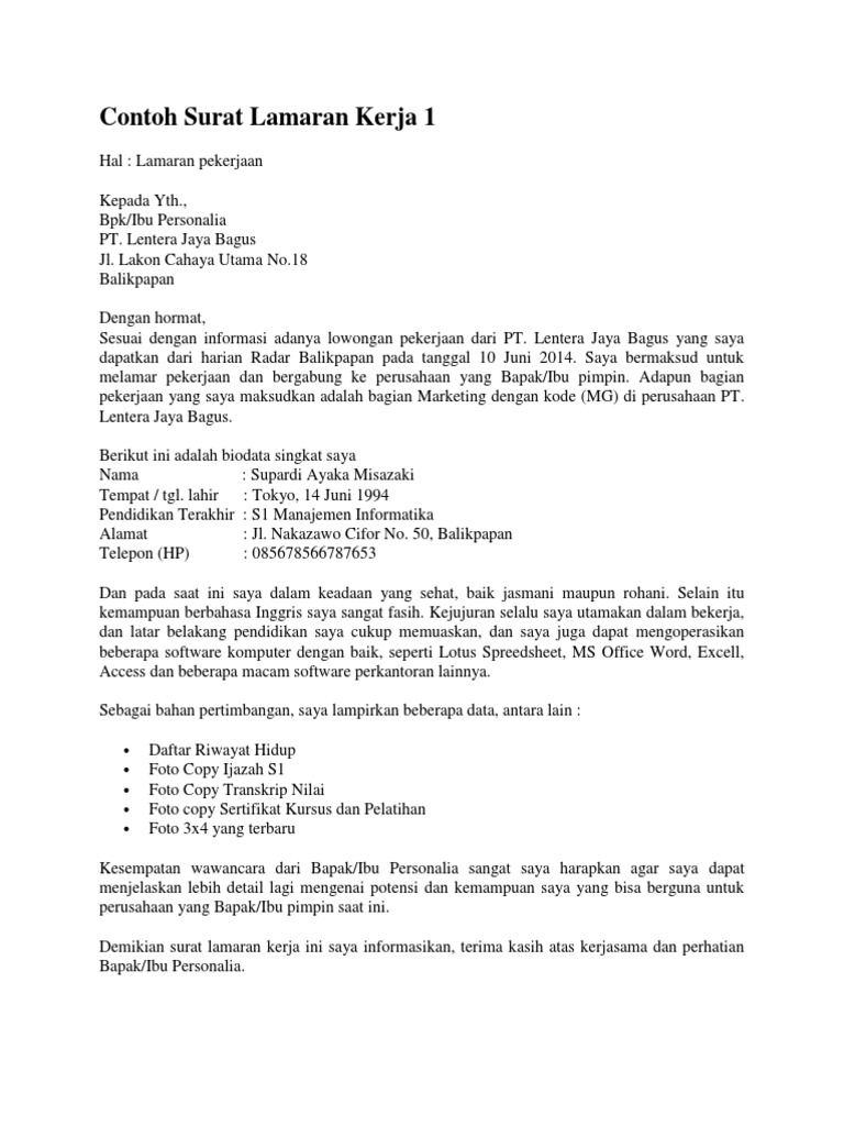 Contoh surat lamaran kerja yang baik dan benar 2014. Blog lowongan kerja 2014 kali ini akan memberikan sedikit contoh surat lamaran kerja yang semoga bisa membantu anda semua dalam mencari kerja. Contoh surat lamaran kerja yang baik dan benar untuk dijadikan referensi dalam usaha mencari kerja di sebuah perusahaan sesuai dengan keahlian kamu. Format penulisan surat lamaran kerja beberapa tips dan contoh surat lamaran kerja secara umum yang baik dan benar di pt dalam bahasa indonesia terbaru. Contoh surat lamaran kerja memang sudah tersebar luas di internet artinya jika teman teman mencari di google pastinya akan menemui banyak sekali blog yang membahas dan mengajarkan kepada anda bagaiamana cara membuat surat lamaran yang baik dan benar. Penulisan surat yang baik harus ditulis berdasarkan struktur dan format yang benar. Tahun tahun belakangan ini surat lamaran kerja itu mulai berpengaruh terhadap kualitas seseorang jadi apabila semakin baik kita dalam membuat surat lamaran kerja akan berpengaruh besar dalam sebuah personalian untuk mempertimbangkan anda.
