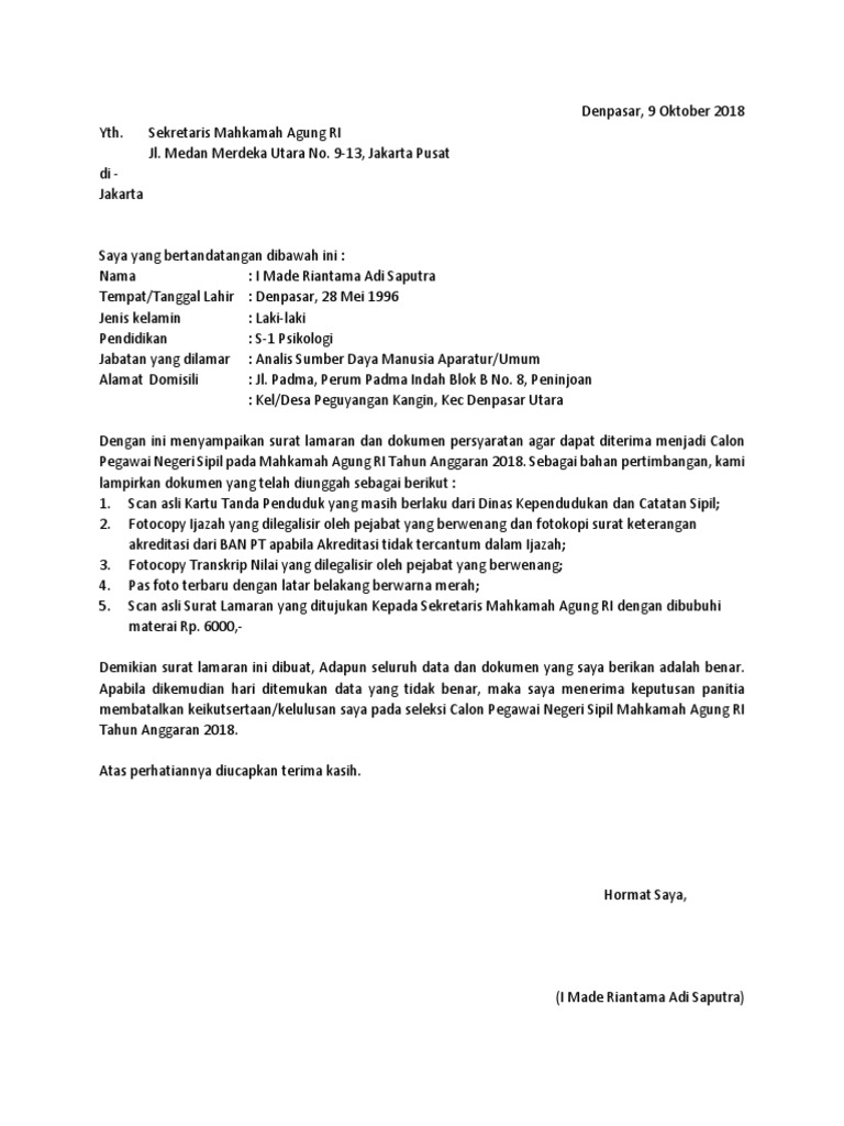 Contoh surat lamaran mahkamah agung cpns 2018. Contoh lamaran cpns mahkamah agung. Membuat surat lamaran cpns bagi yang belum pernah memang sedikit susah. Nah bagi anda yang sedang membutuhkan referensi tentang bagaiman cara membuat surat lamaran cpns berikut ini kami sediakan contoh surat lamaran cpns untuk lulusan sma di salah satu kementerian yang kebetulan di tahun 2019 ini sedang membuka pendaftaran cpns. Surat pengadaan telah diterbitkan oleh lembaga tersebut juga meminta lembaga pemerintah pusat dan daerah mengusulkan kebutuhan formasi. Contoh surat lamaran cpns 2018download contoh surat lamaran cpns guru 2018. Contoh detail masing masing surat lamaran cpns untuk instansi pemerintah pusat seperti kementerian lembaga negara.