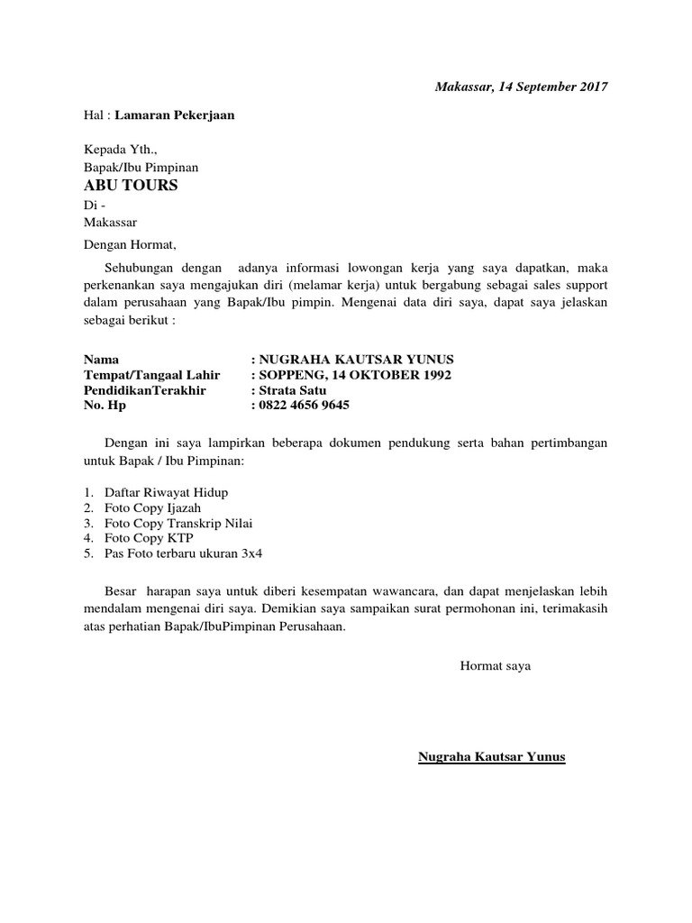Contoh surat lamaran kerja berikut contoh surat lamaran pekerjaan yang bisa kamu download file dokumennya. Contoh iklan lowongan pekerjaan dan surat lamarannya di atas bisa menjadi referensi anda untuk membuat iklan lowongan pekerjaan maupun menulis surat lamaran pada perusahaan impian anda. Surat lamaran kerja dibutuhkan guna melamar pekerjaan baru untuk kamu yang baru lulus kuliah pindah kerja cari suasana baru maupun fresh graduate. Pekerjaan anda seiring dengan bertambahnya hari semakin penuh sesak. Contoh surat lamaran kerja di perusahaan seringkali dicari oleh para pencari kerja yang ingin mengajukan lamaran pekerjaan di perusahaan perusahaan yang ada di indonesia. Perhatikan halhal detail dalam menulis iklan lowongan ataupun menulis surat secara baik dan benar.