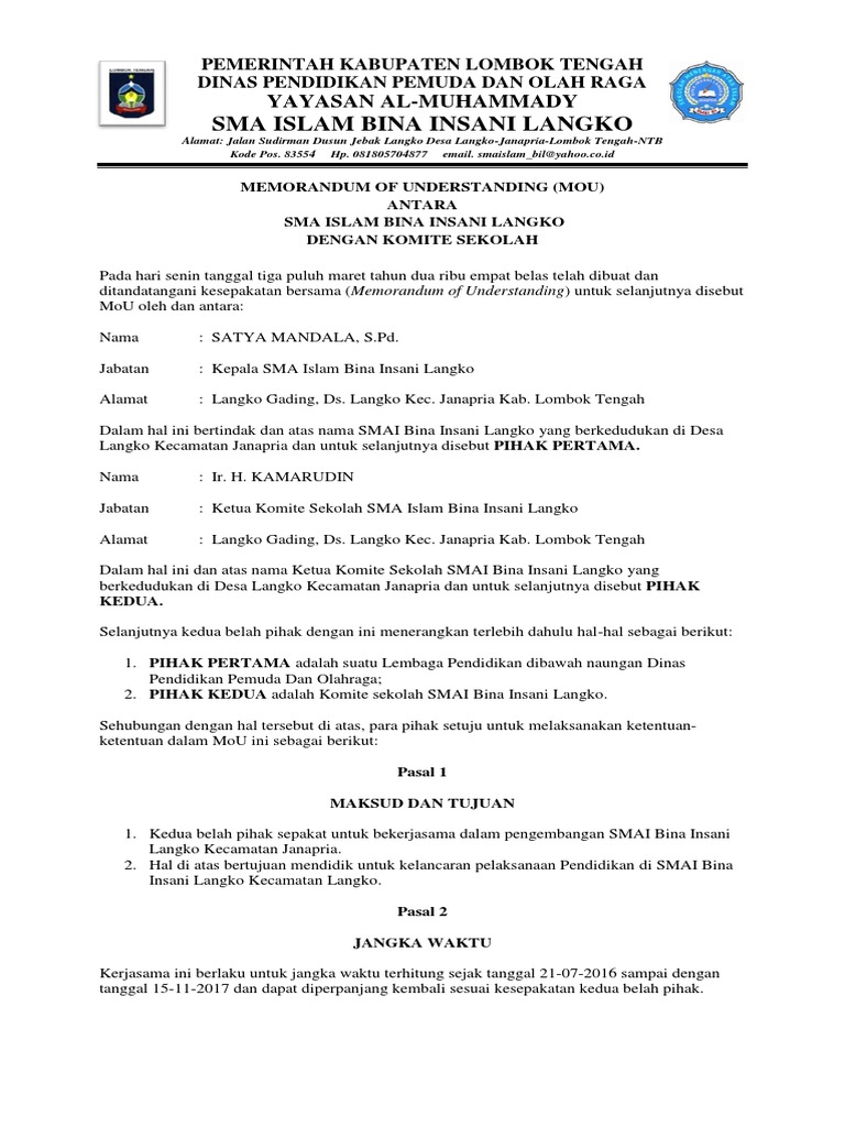 Perjanjian antar dua pihak ini biasa dikenal dengan istilah memorandum of understanding mou. Sebuah mou tak hanya berisi kerjasama usaha yang membahas masalah bisnis saja mou juga bisa berisi kesepakatan kerjasama di bidang lain yang cakupannya lebih luas dan bebas. 5 contoh mou kerjasama perusahaan perjanjian kerja perjanjian memang sangat diperlukan untuk mengetahui apa saja hal hal yang membatasi kedua belah pihak yang berjanji dan salah satu cara untuk mengetahui hal tersebut adalah dengan membuat contoh mou kerjasama karena di dalamnya akan menjelaskan apa saja poin poin kesepakatan yang dibuat. Contoh surat perjanjian kerjasama sekolah dengan puskesmas guru gaul 01 february 2014. Pengertian surat mou mou atau memorandum of understanding atau nota kesepahaman merupakan surat yang menyatakan persetujuan antara kedua belah pihak. Kedua belah pihak sepakat mengadakan perjanjian kerjasama dengan ketentuan ketentuan yang diatur dalam pasal pasal berikut.