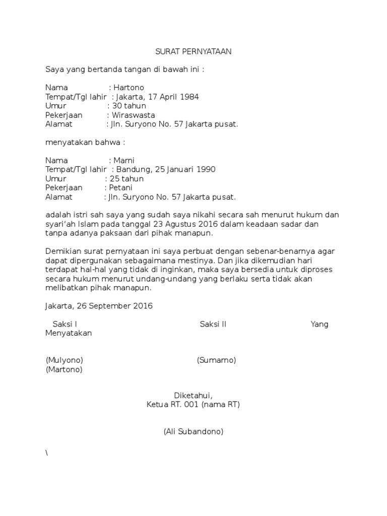 Bebarapa hal yang diperlukan untuk mengurus surat pernyataan nikah siri adalah. Contoh surat nikah siri. 8 contoh surat pernyataan cerai terlengkap assalam print contoh surat cerai sederhana. Tanda tangan mempelai pria dan wanita tanda tangan saksi saksi dan tanda tangan pejabat setempat yang mengesahkan telah terjadi pernikahan tersebut. Apa saja syarat yang harus disediakan untuk keperluan menikah baik yang siri atau resmi secara islam. Sehingga untuk bisa mendapatkan surat nikah sebagai syarat pernikahan yang diakui oleh negara adalah calon pengantin mampu mengetahui dengan seksama cara mengurus surat nikah yang benar.