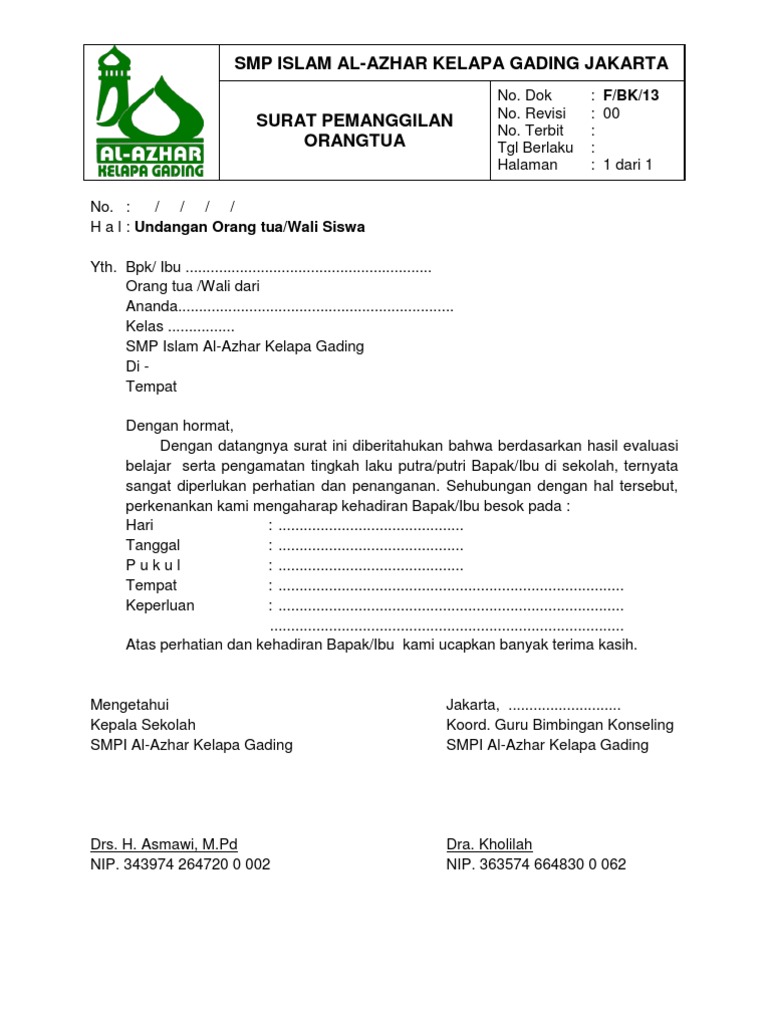 Download Contoh Surat Panggilan Orang Tua Dari Sekolah Karena