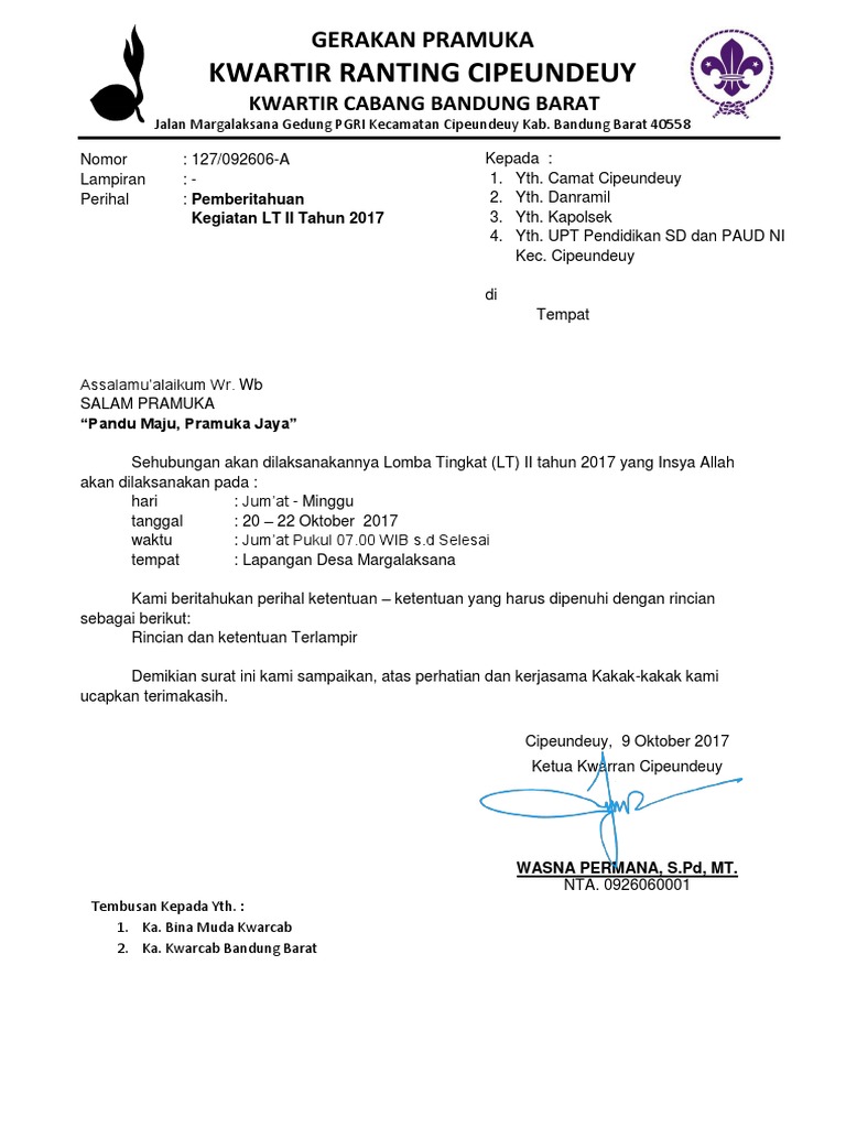 Demikian surat pemberitahuan dan undangan kami atas perhatian dan kerjasamanya yang baikdisampaikan terima kasih. Tidak heran kalau sudah semakin banyak orang meninggalkan penggunaan surat sebagai media komunikasi. Surat berikut ini adalah contoh contoh surat pemberitahuan yang dapat di. Misalnya kegiatan outbound kemah pendakian gunung dan lain lain. Proses komunikasi menjadi lebih cepat dan canggih. Surat pemberitahuan kegiatan perkemahan pramuka saturday march 17 2018 add comment surat pemberitahuan kegiatan perkemahan pramuka adalah surat yang dapat digunakan oleh pembina pramuka untuk memberitahukan menginformasikan kepada orangtuawali siswa anggota pramuka bahwa akan diadakannya perkemahan.