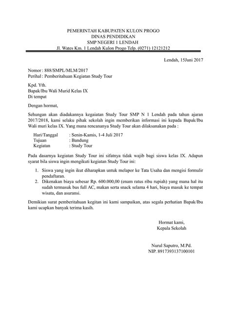 Contoh surat pemberitahuan study tour. Contoh surat pemberitahuan study tour sekolah terbaru 2020 ini dibuat menggunakan format word doc sehingga bapakibu guru dapat dengan mudah mengeditnya sesuai kebutuhan. Contoh surat pemberitahuan kegiatan study tour. Untuk kegiatan di luar lingkungan sekolah bisa diadakan kegiatan study tour. Silahkan disimak sebuah contoh surat berikut ini. Yang terhormat bapakibu wali murid kelas vii smp n 1 ronggo di tempat dengan hormat berdasarkan hasil rapat orang tua wali pada tanggal 10 januari 2018 yang lalu smp n 1 ronggo tahun ajaran 20172018 akan mengadakan acara study tour yang wajib diikuti oleh seluruh siswa kelas vii. Citra cakrawala radio jalan kelinci merah raya km.